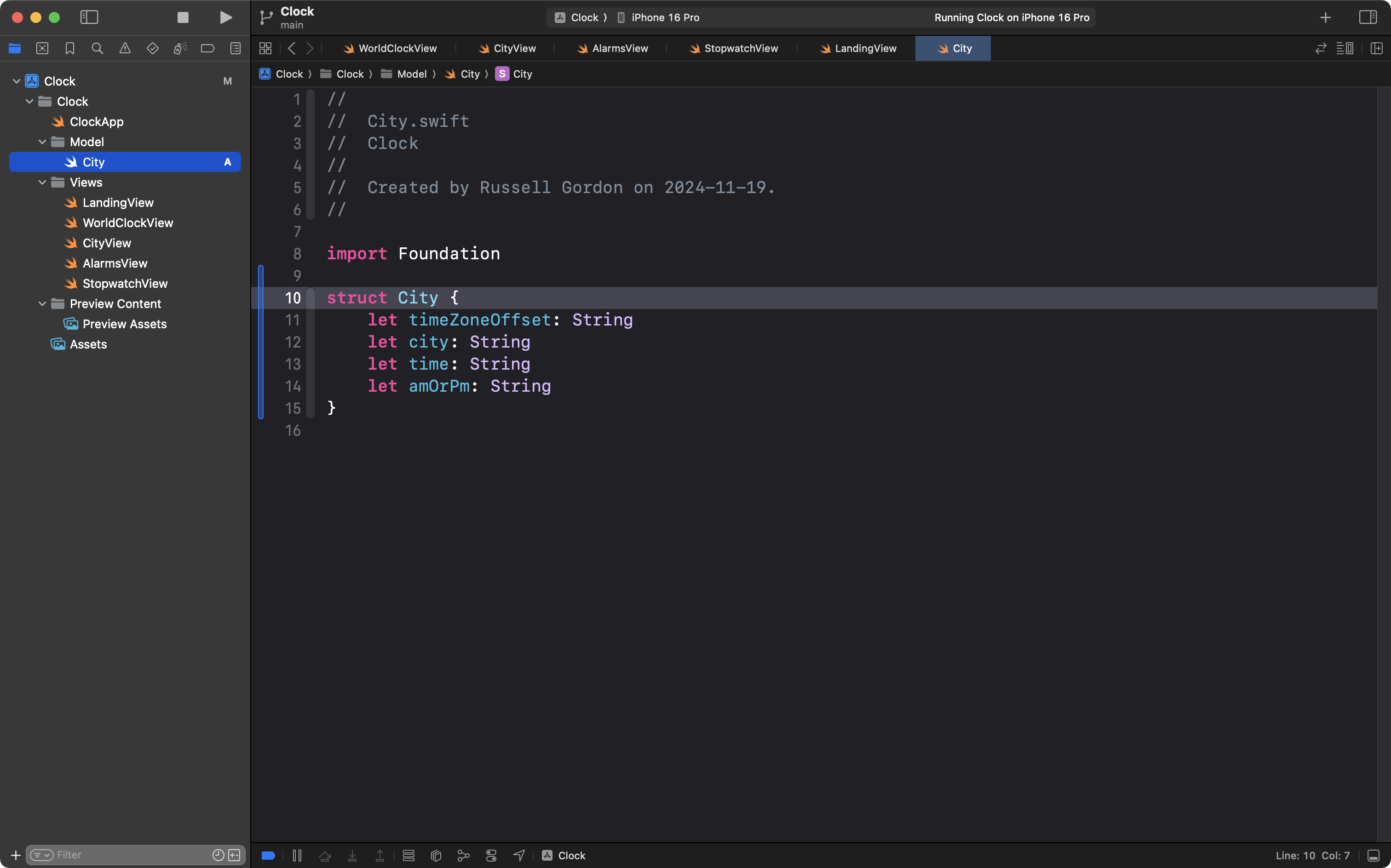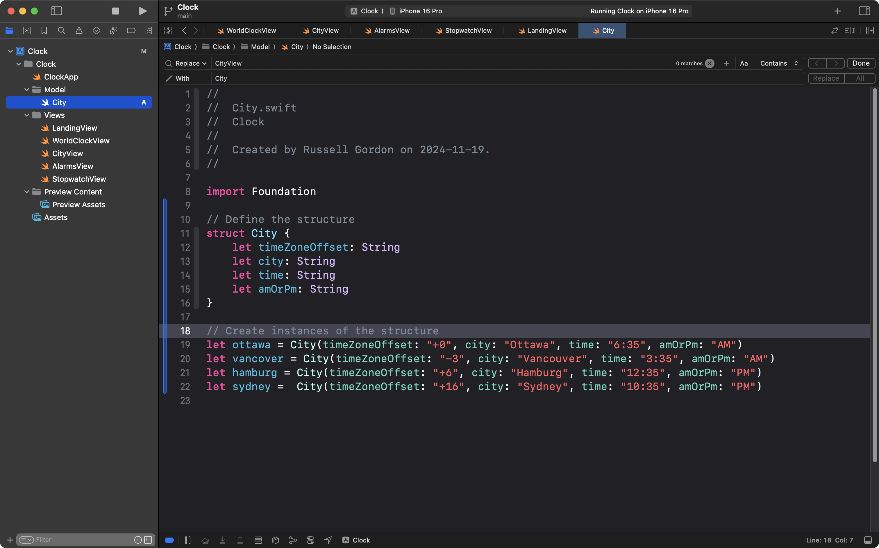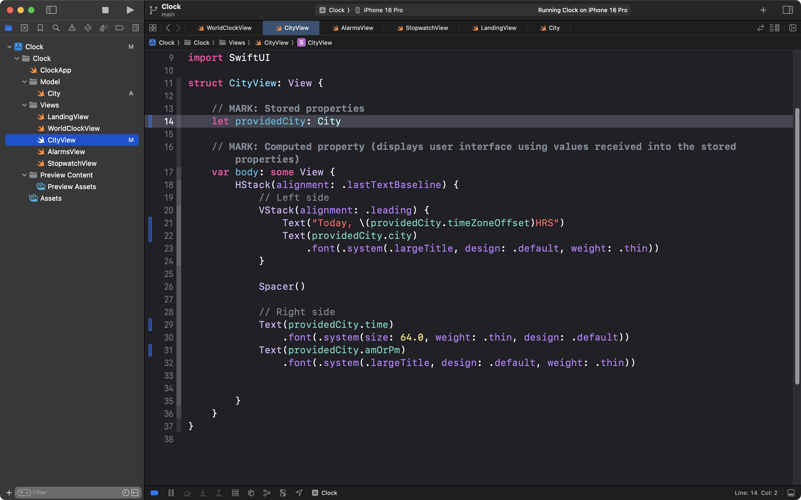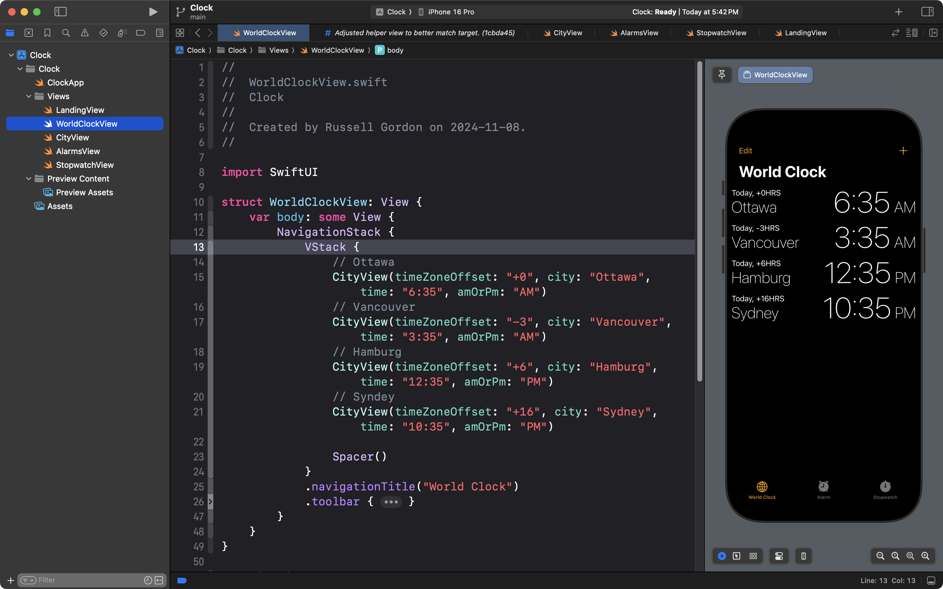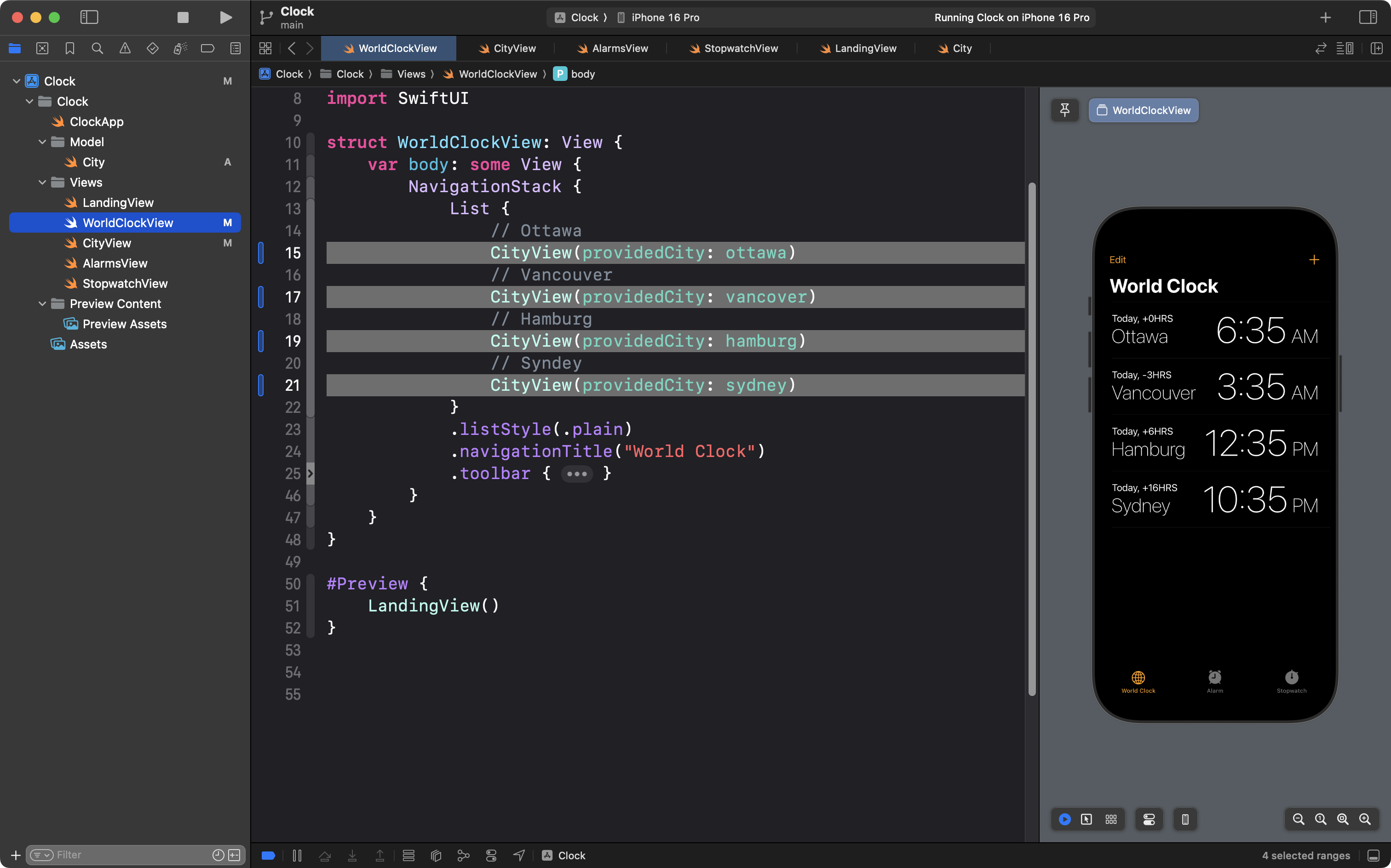 In the example above, a VStack is used to show each city that we created a clock for. A Spacer view is used to push the cities up to the top of the interface.