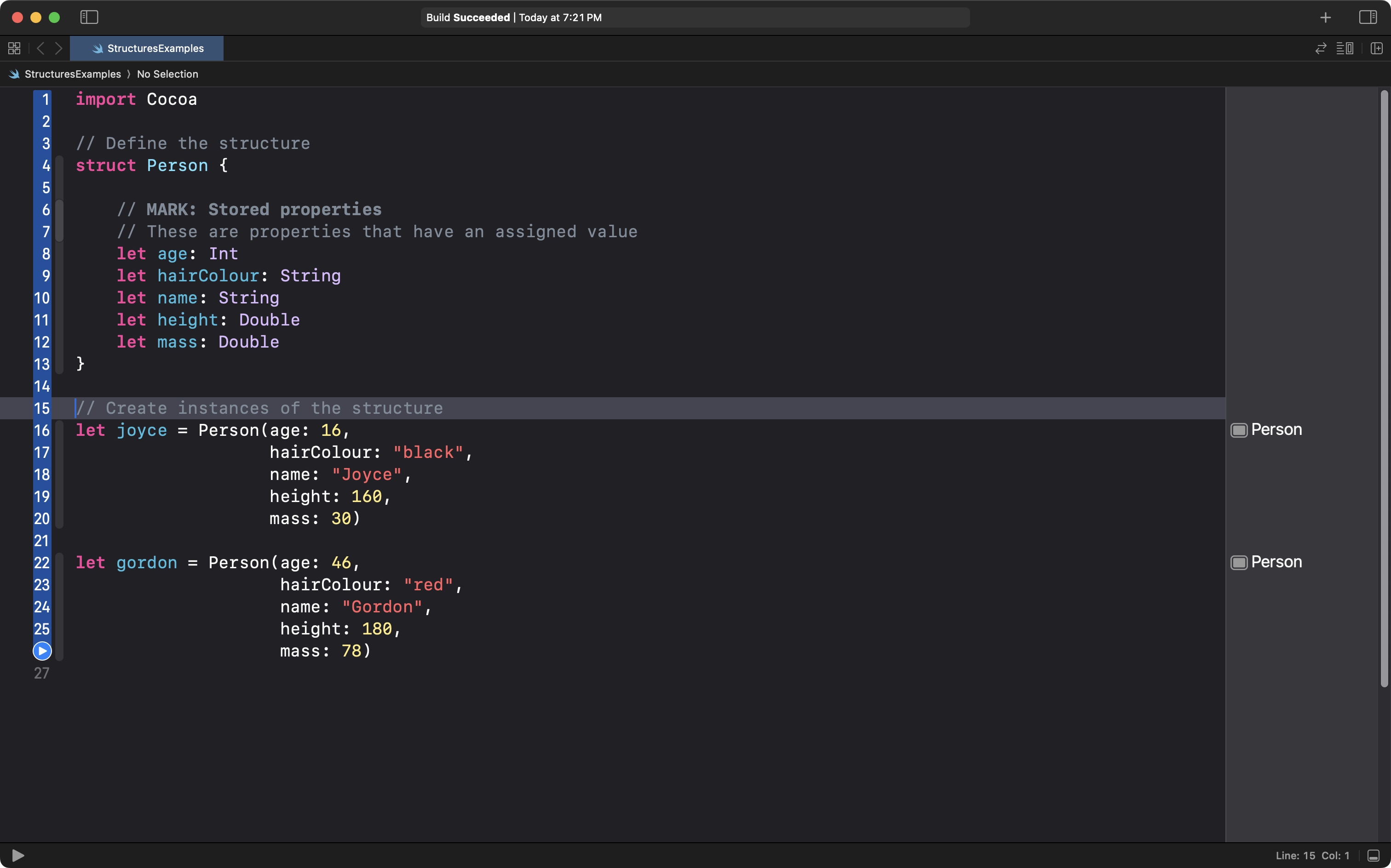 let acceleration = 9.8 // constant, data type is Double Structures allow us to describe more interesting data by grouping related individual variables and constants:
