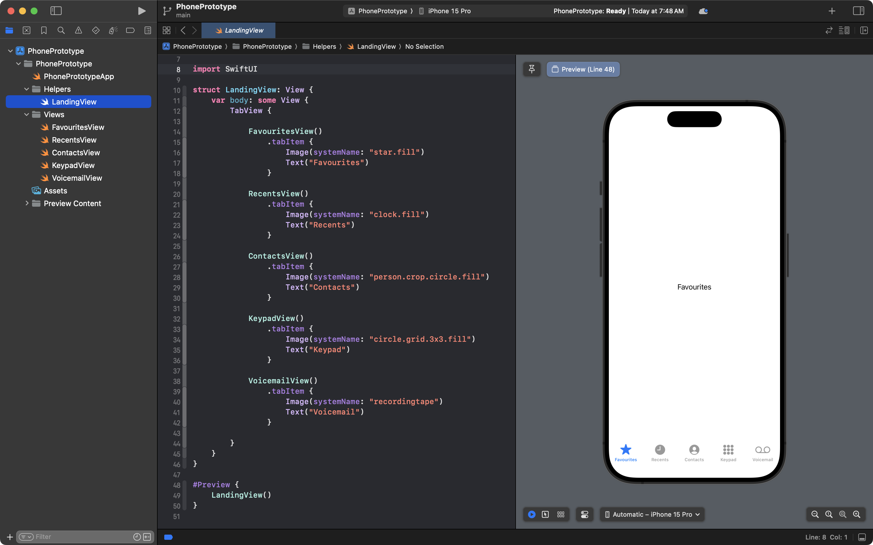 For this particular app, what we want to do is create an instance of LandingView because that is what (in turn) creates a TabView – that much is clear when we preview the LandingView file: