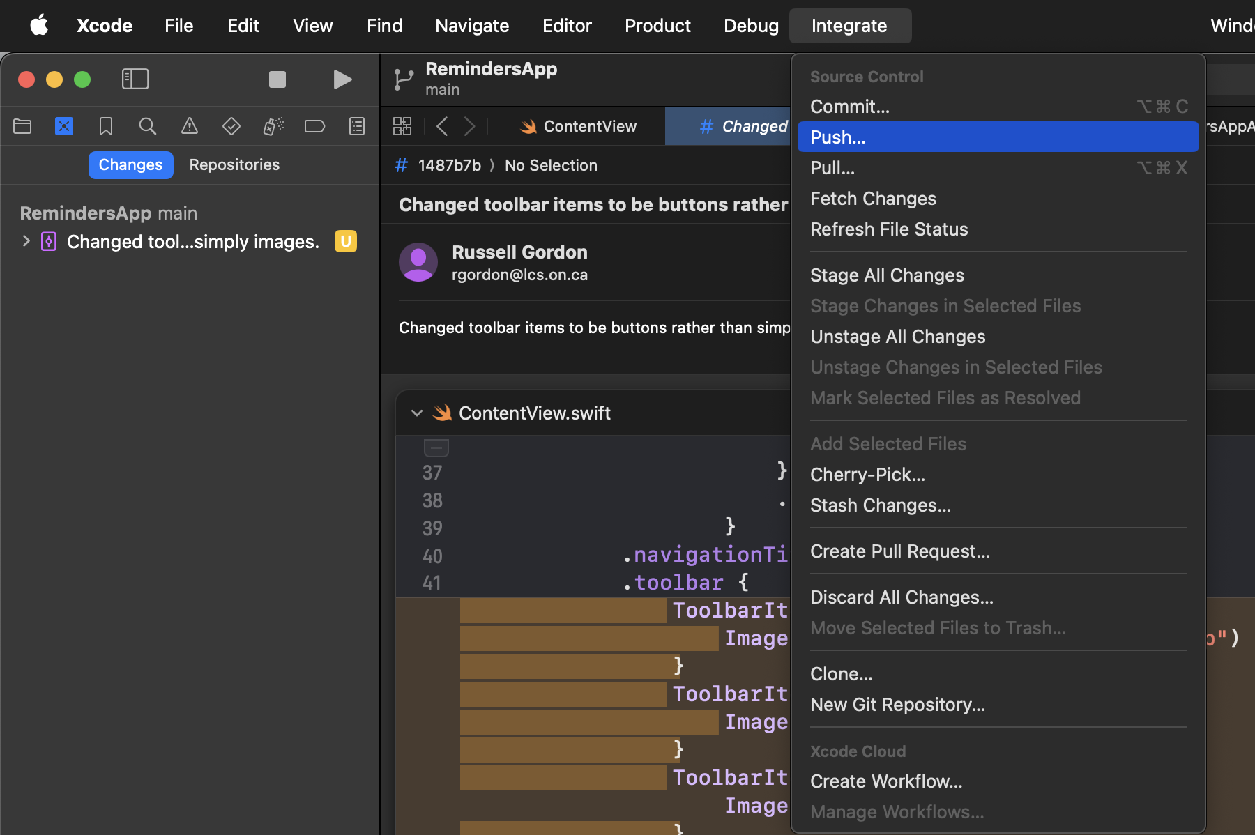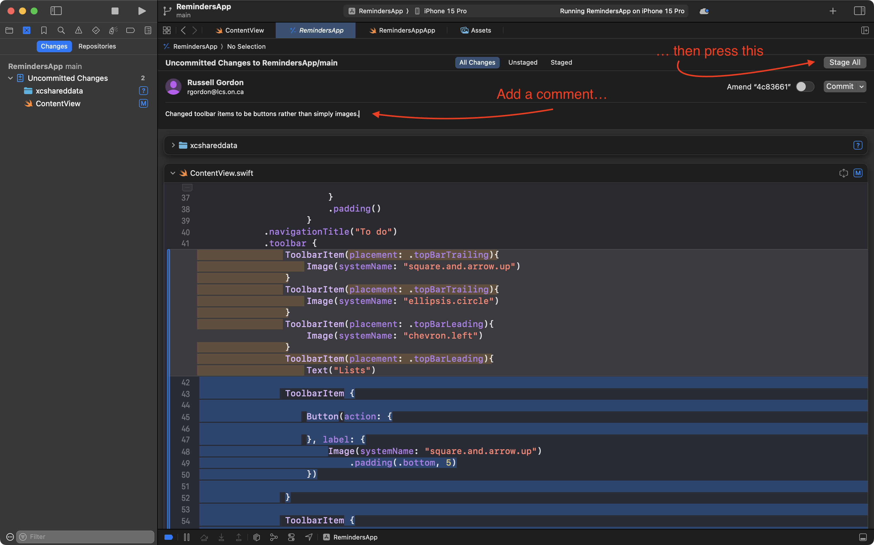 When you commit code using the Option-Command-C keyboard shortcut, or by choosing, from the menus, Integrate > Commit… this opens the interface in Xcode where you can create a save point kept in a local repository on your computer.