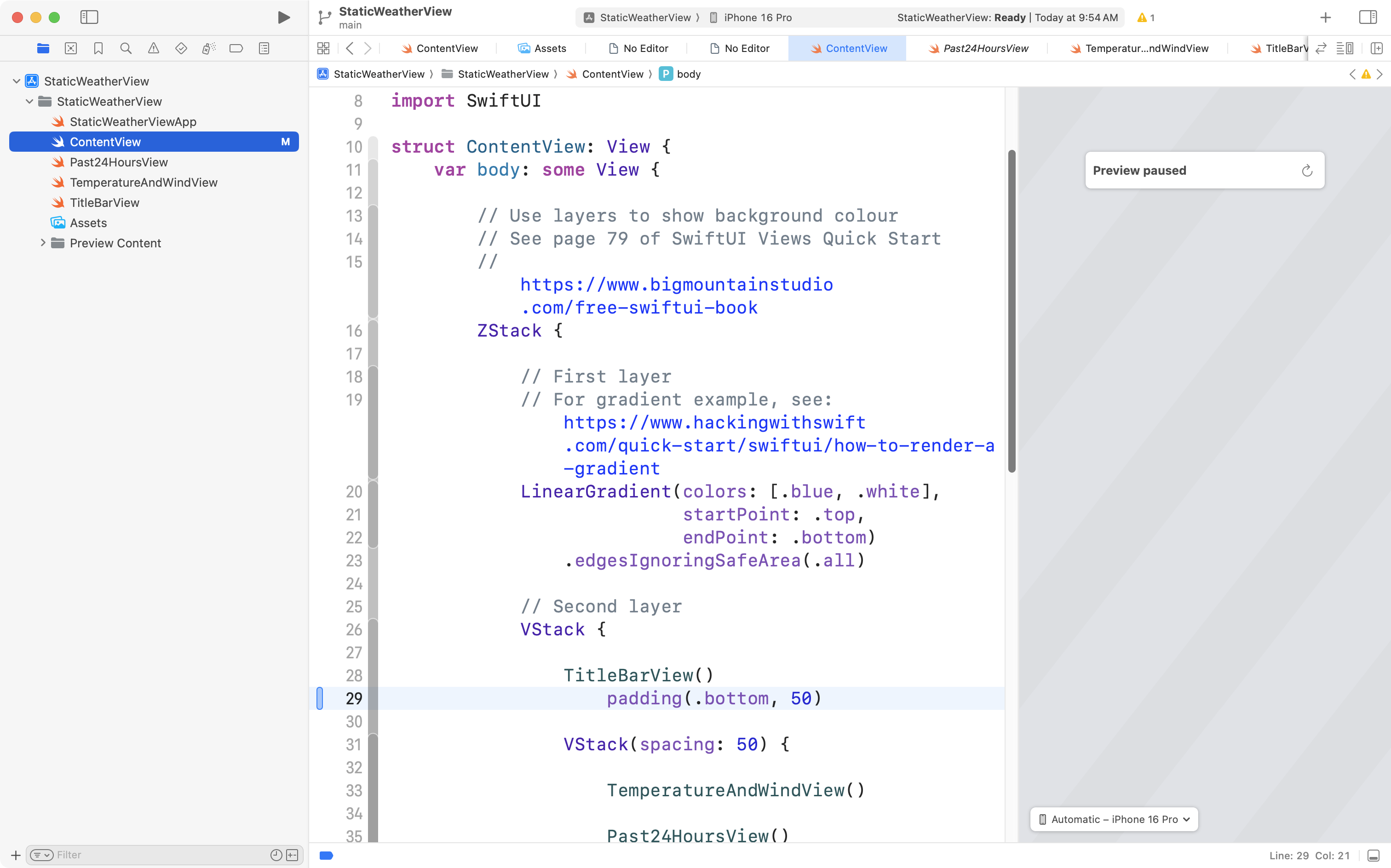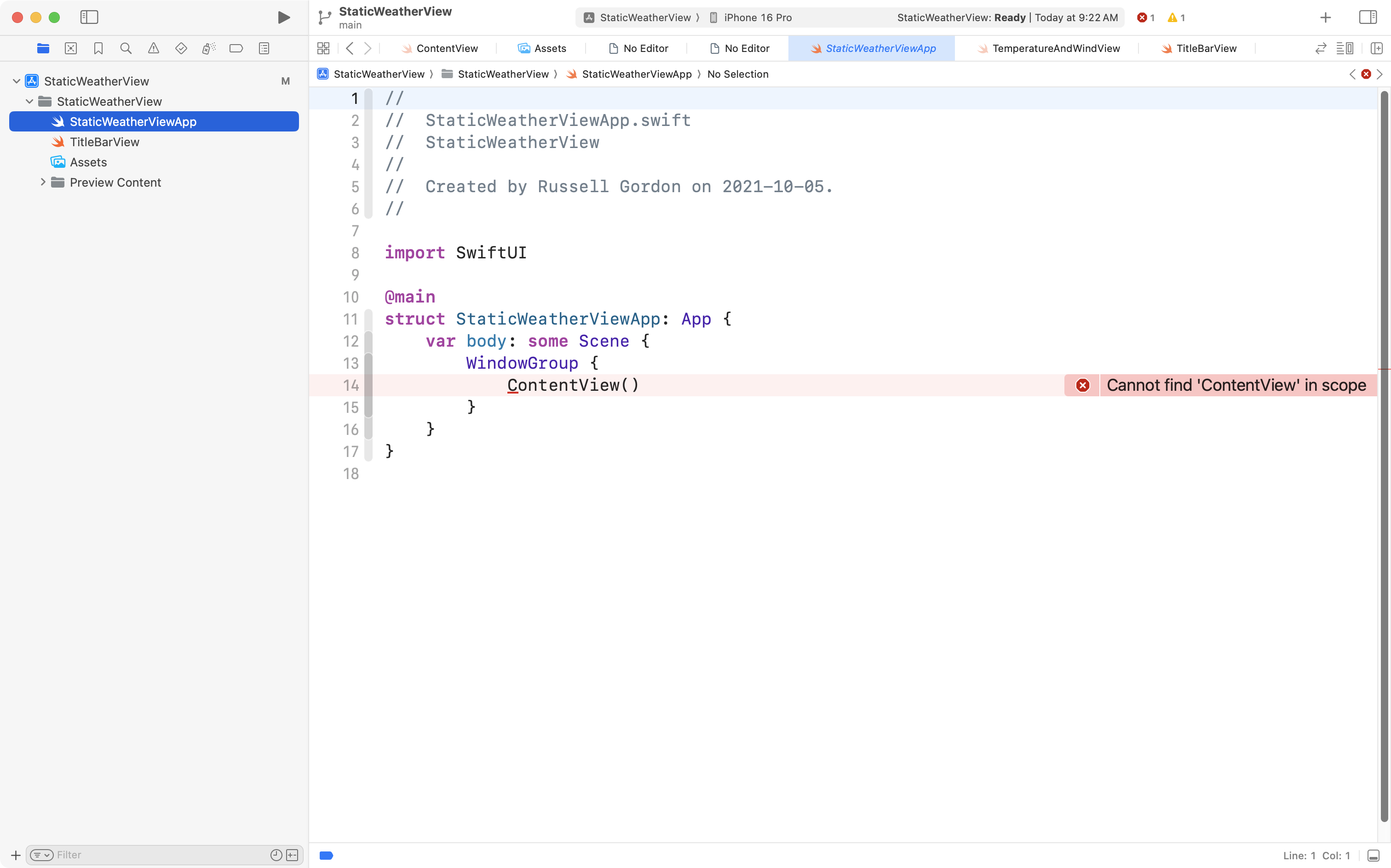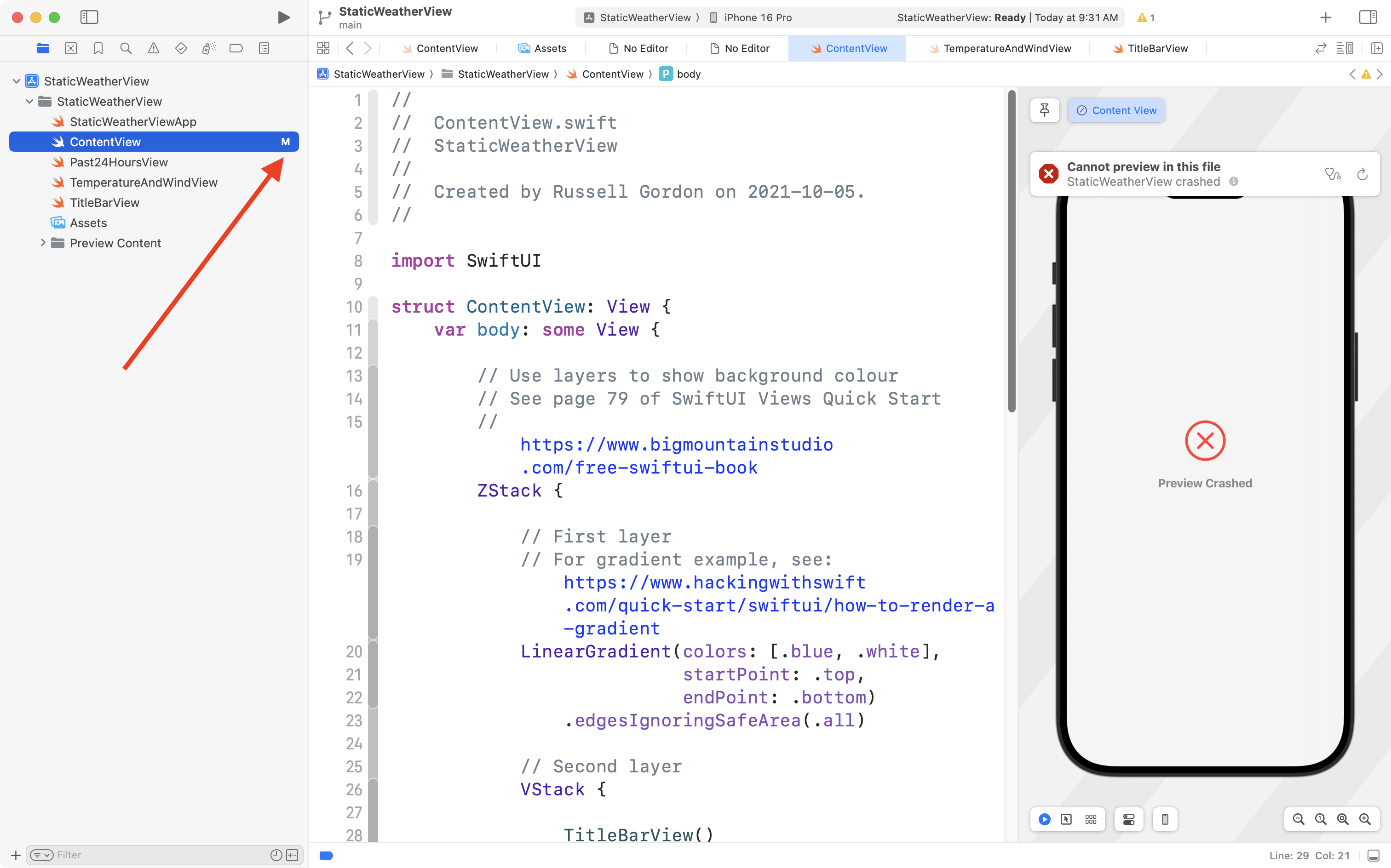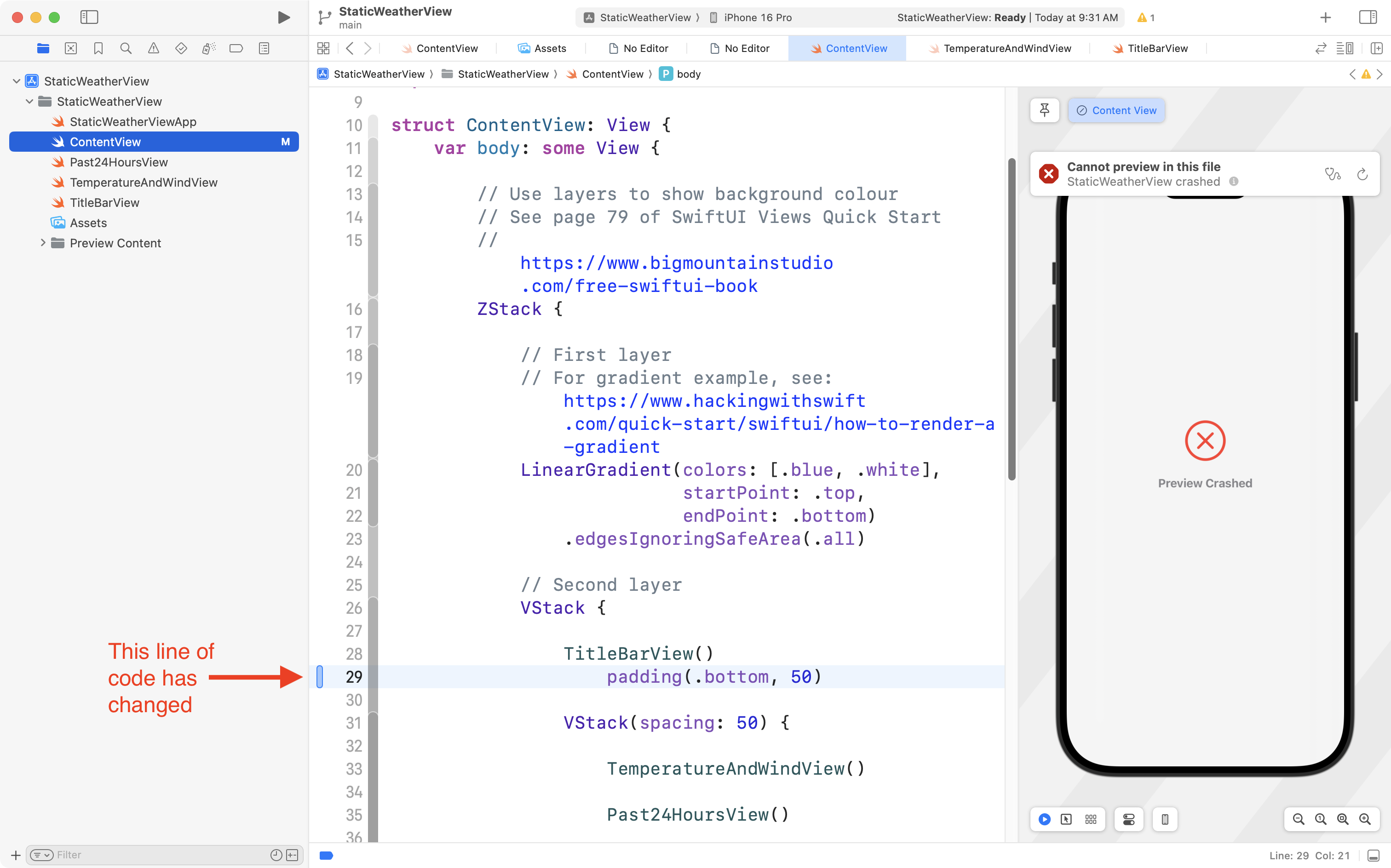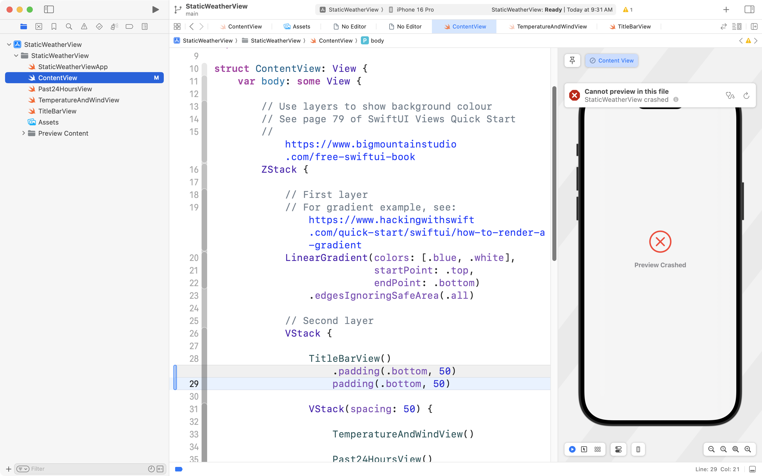 Let’s say from the example above that we still could not find the syntax error – the missing . before the padding() view modifier.