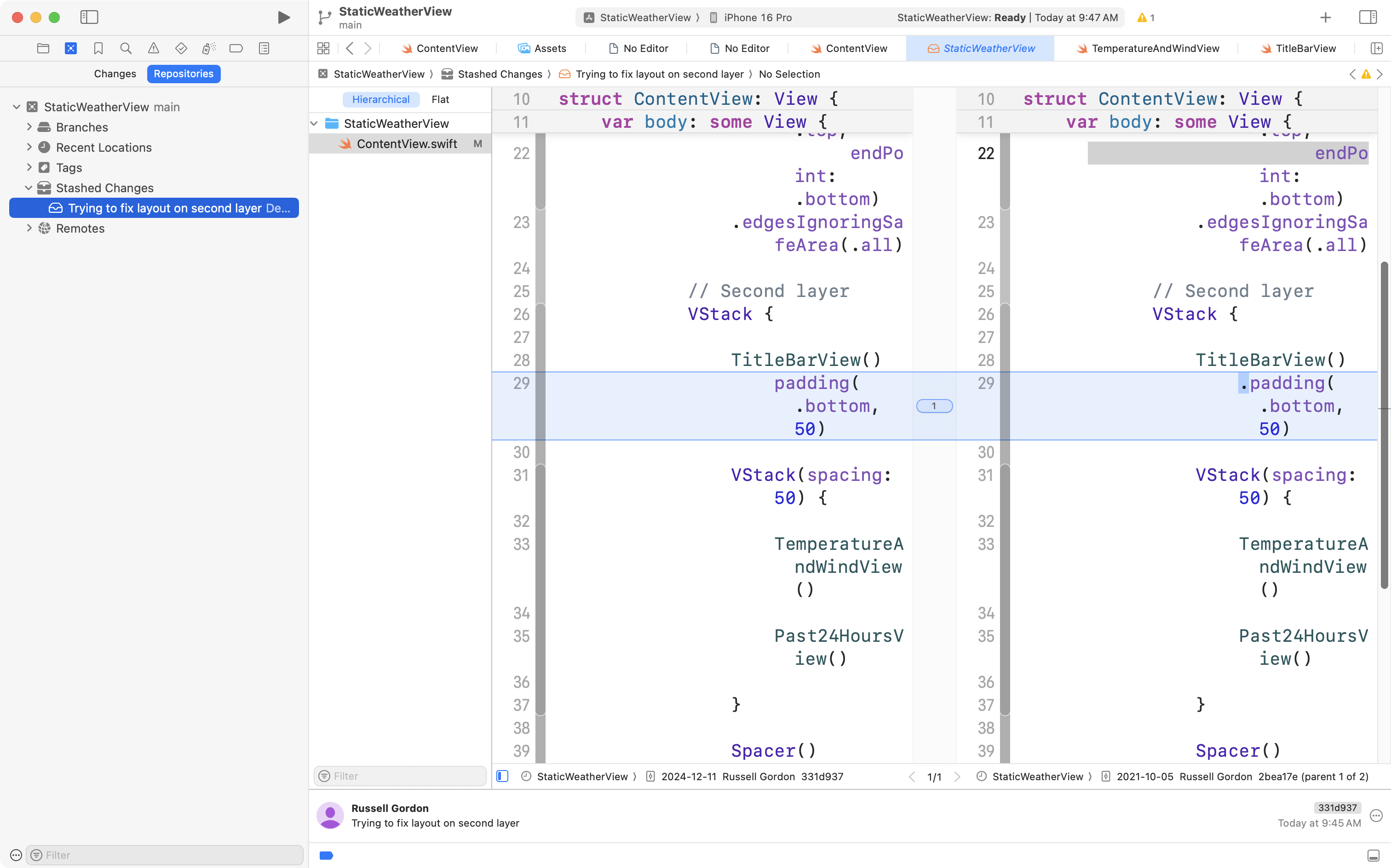 For example, we can see here in this project that we’ve changed just one file – the M means ContentView has been modified since the last commit: