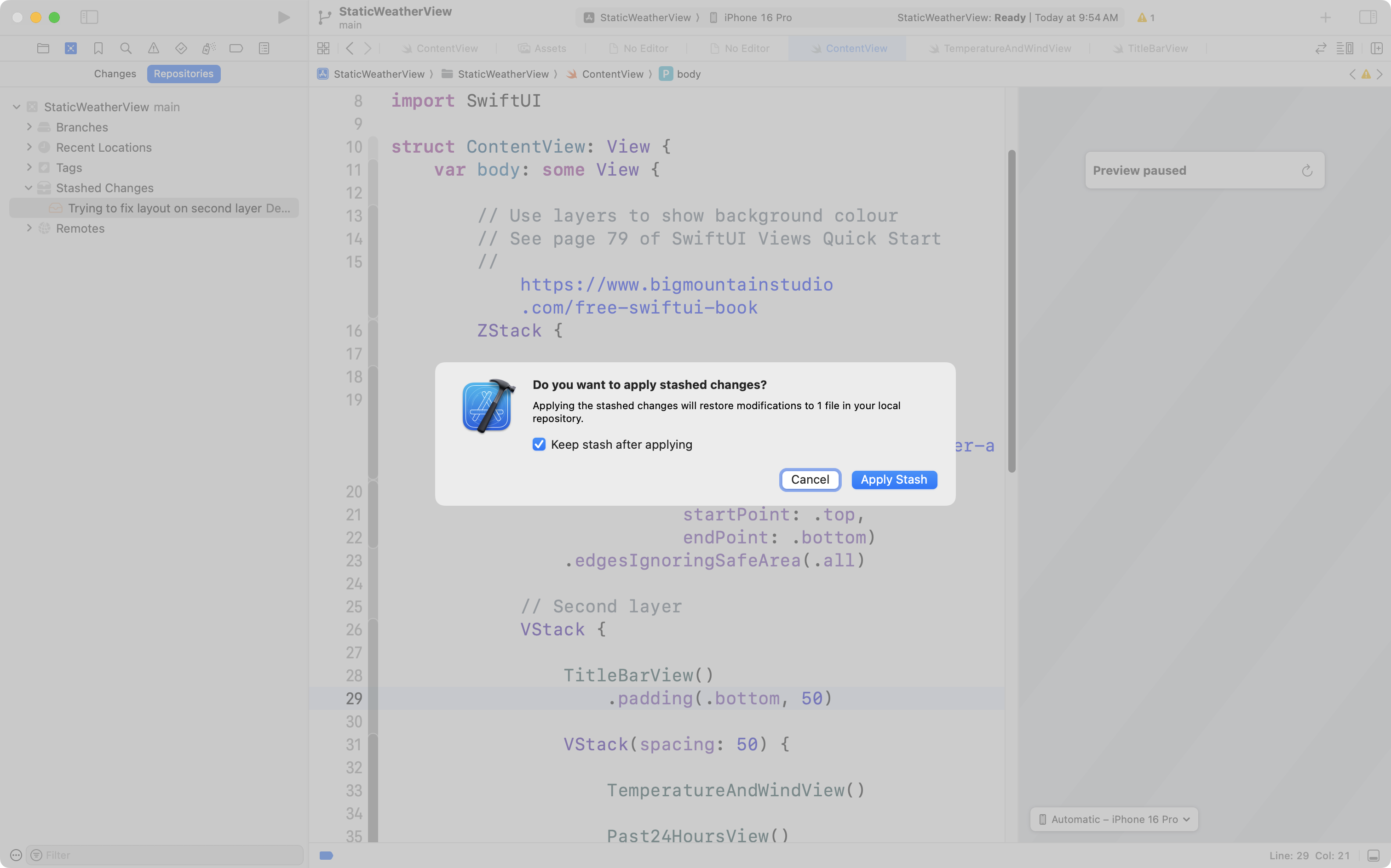Then, back in the project navigator, any code that was in the stash is restored: