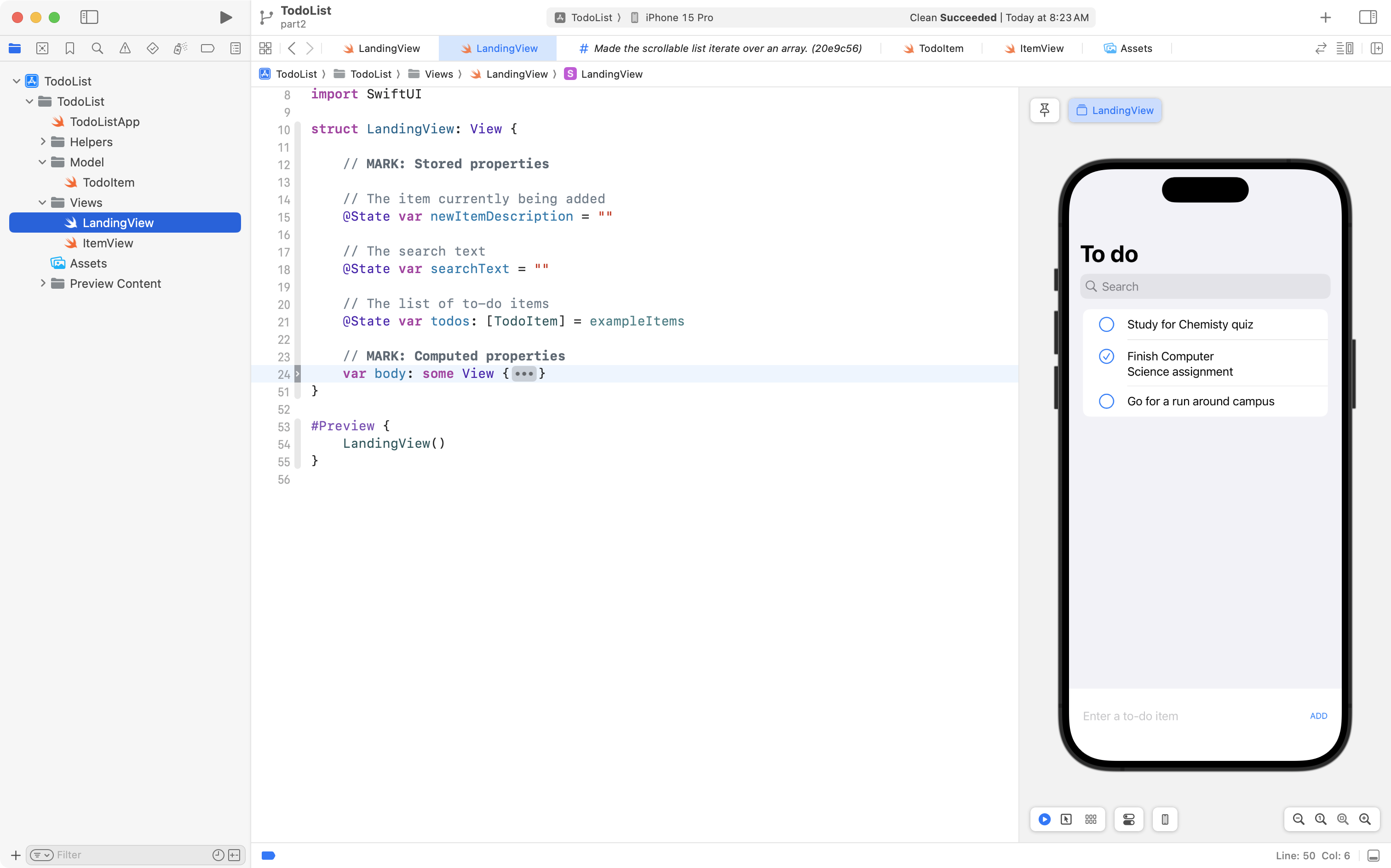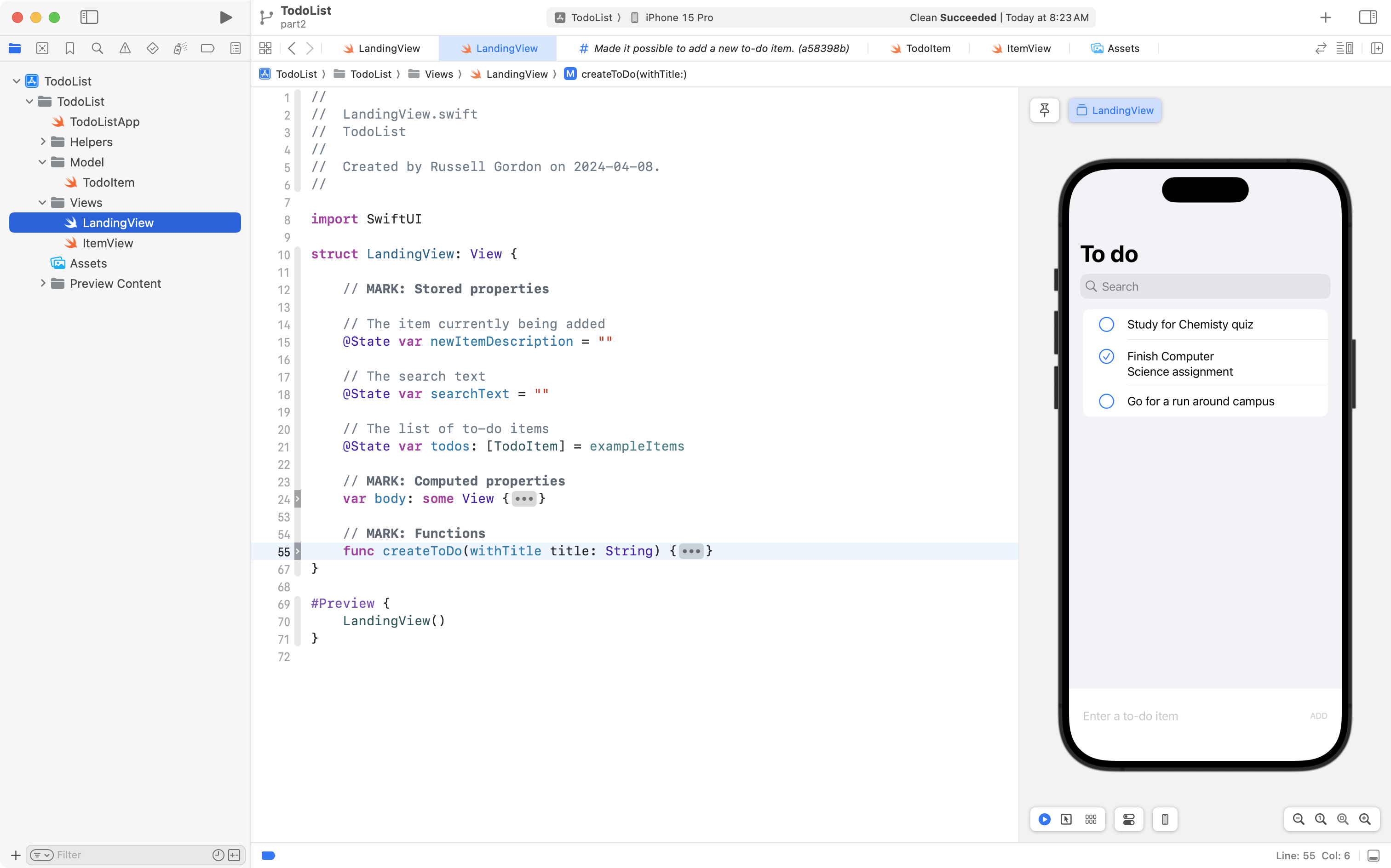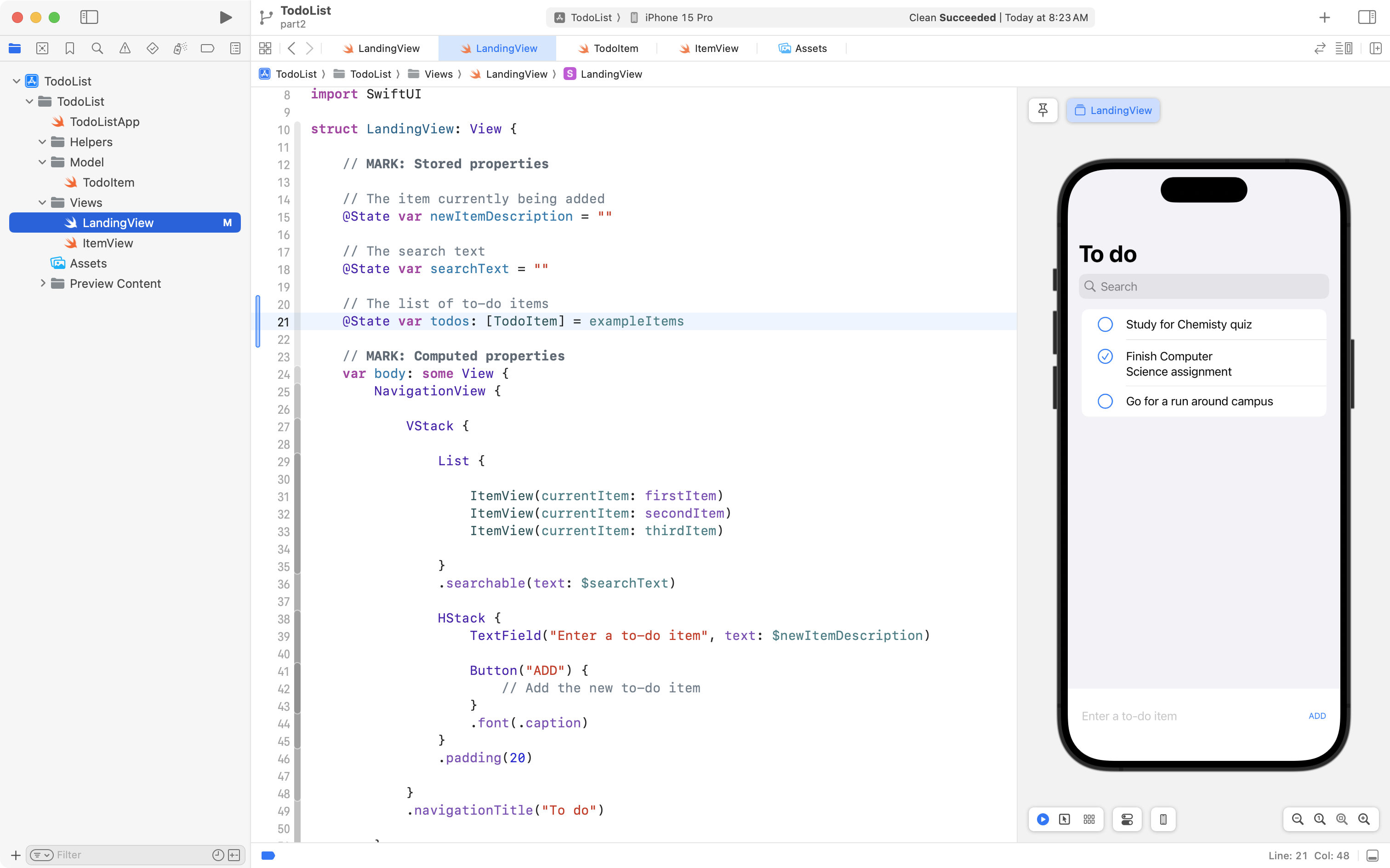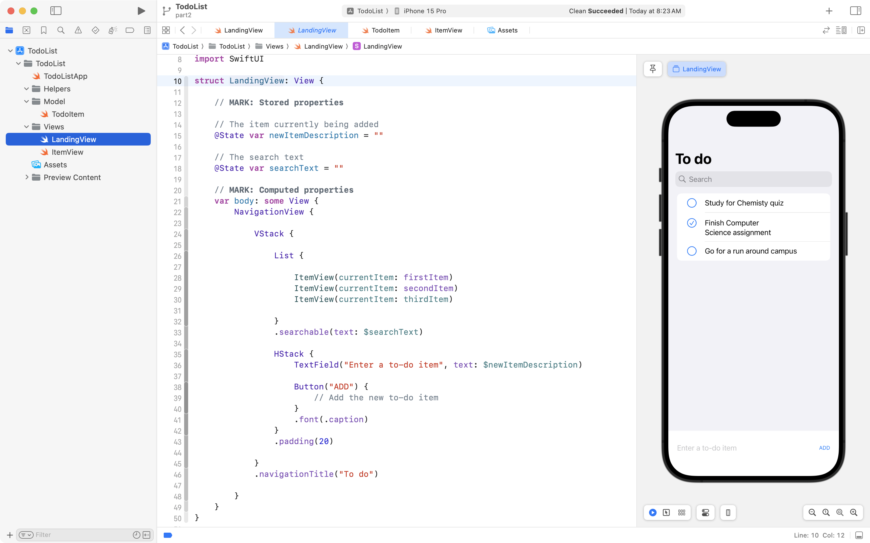 After the createToDo function, but before the closing } of the LandingView structure, add the following function: