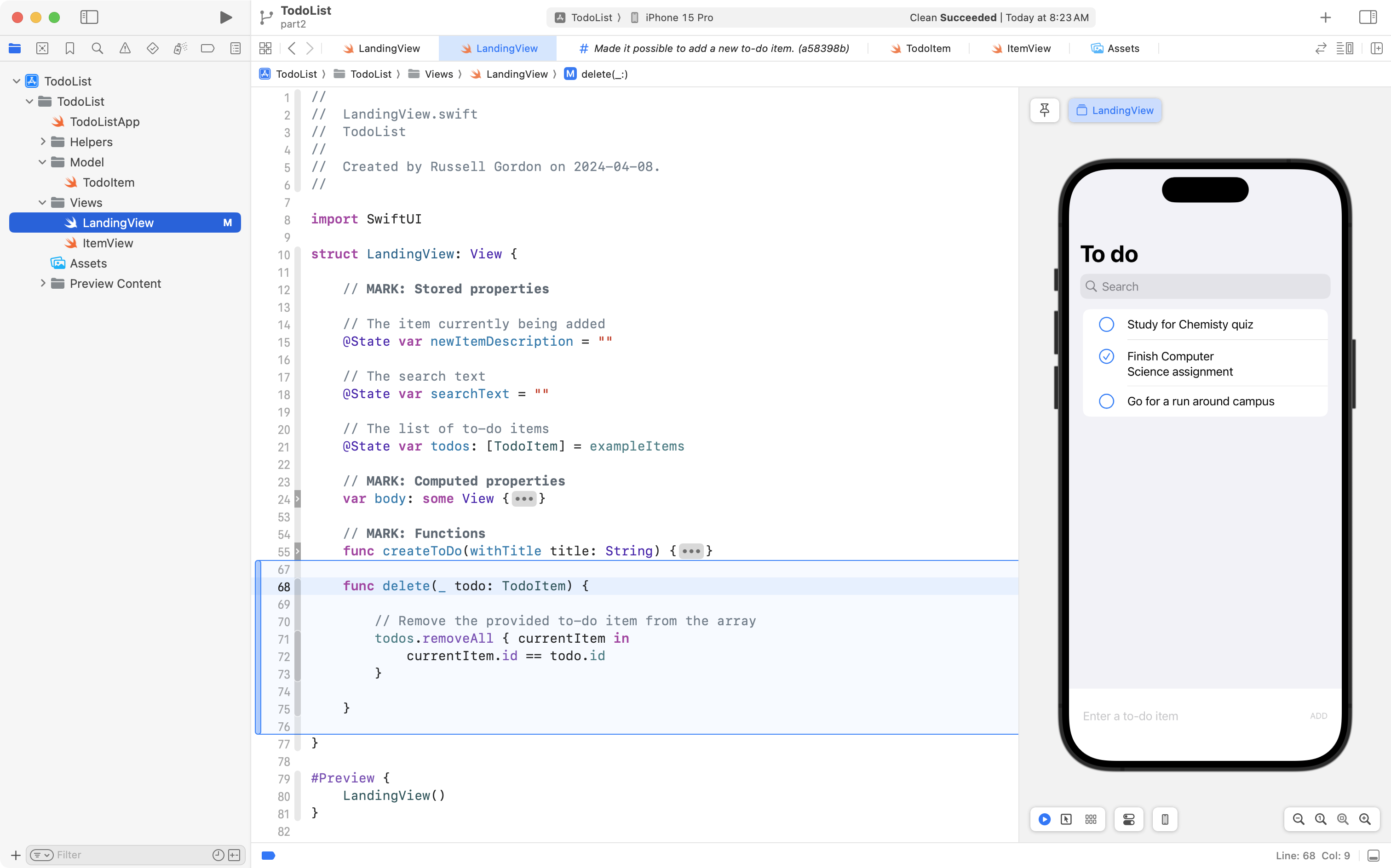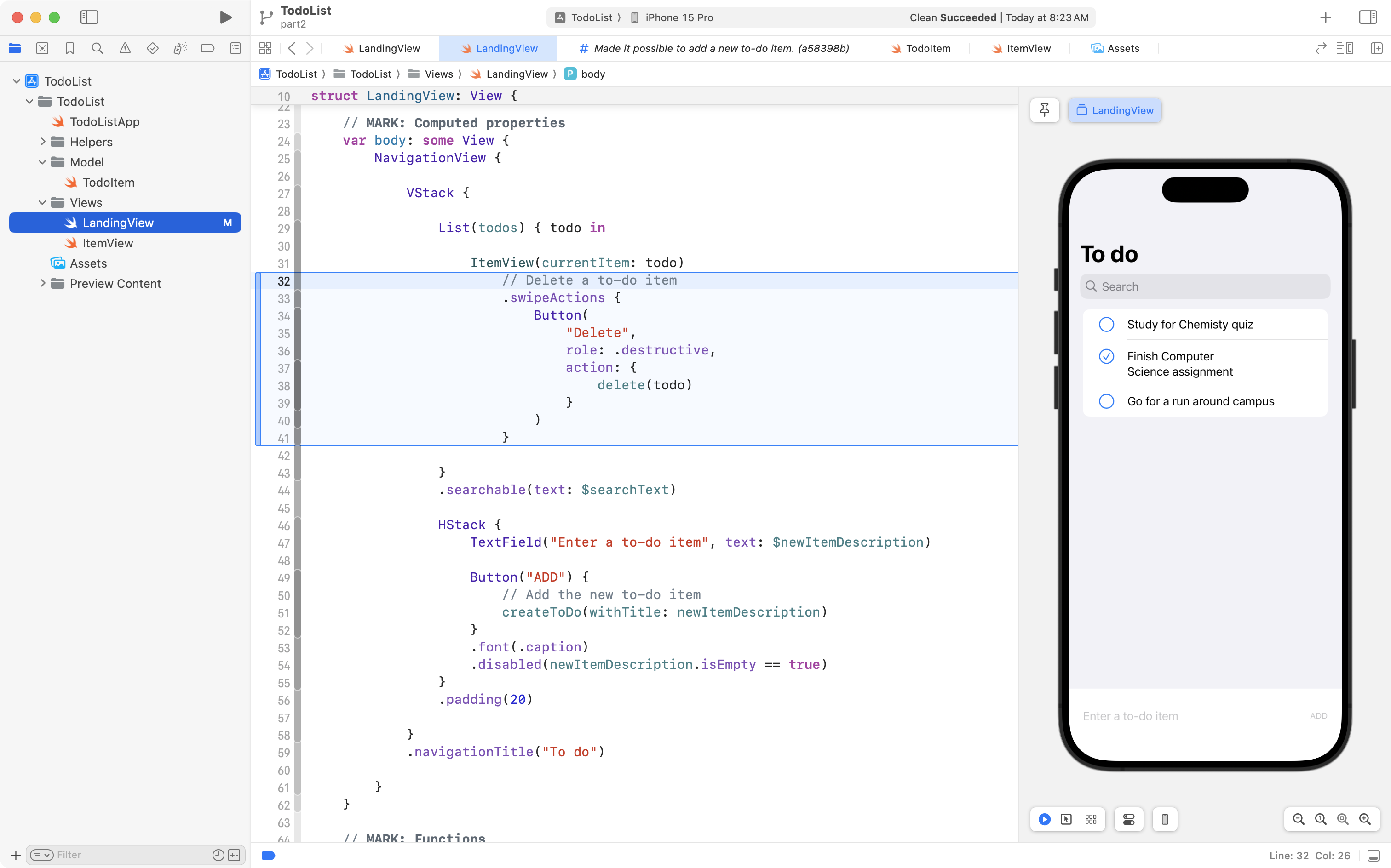 Try tapping on a few to-do items. You will see that the code on line 44 toggles the value of the Bool, or boolean, done property.