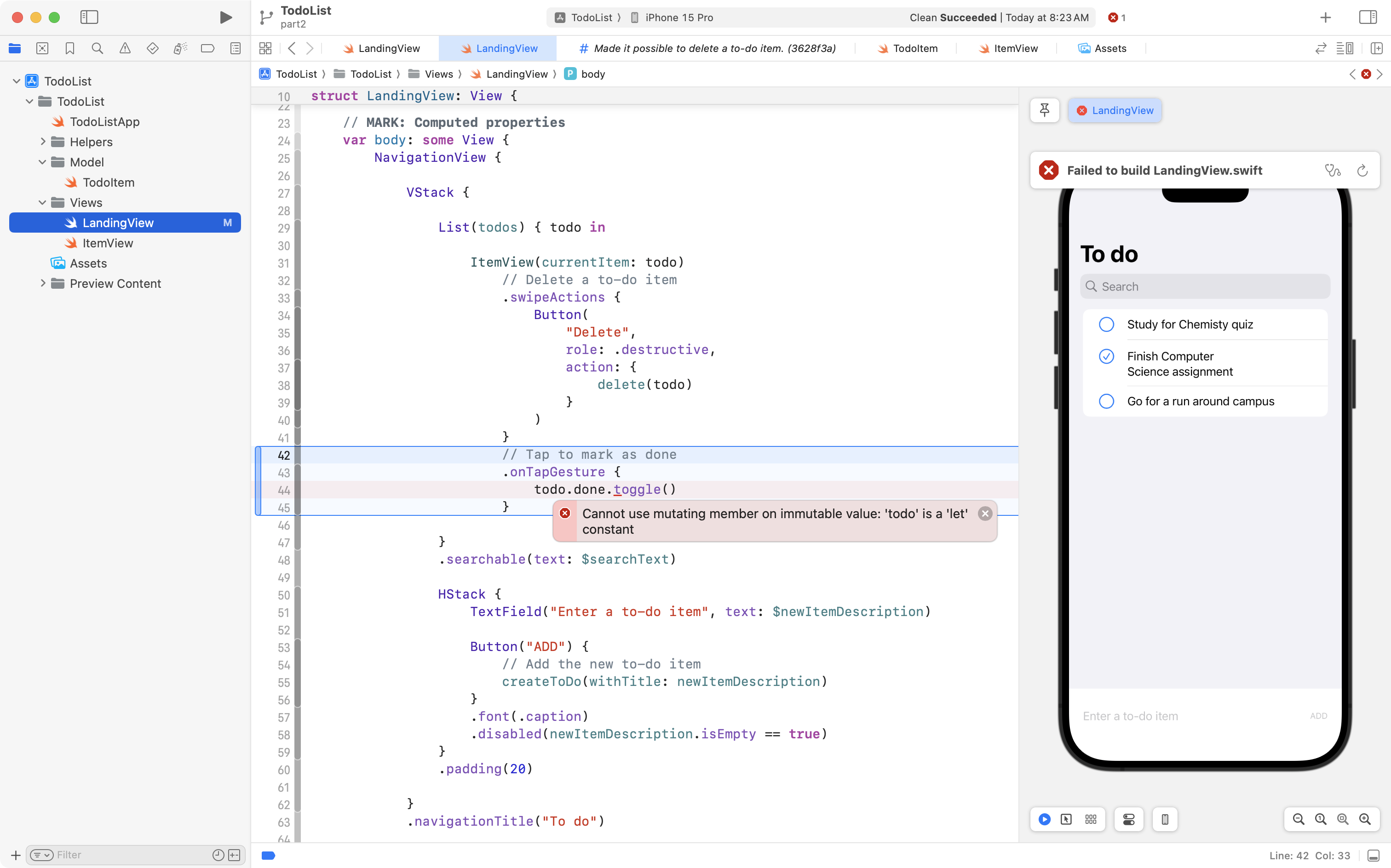 “Cannot use mutating member on immutable value: ‘todo’ is a ‘let’ constant”