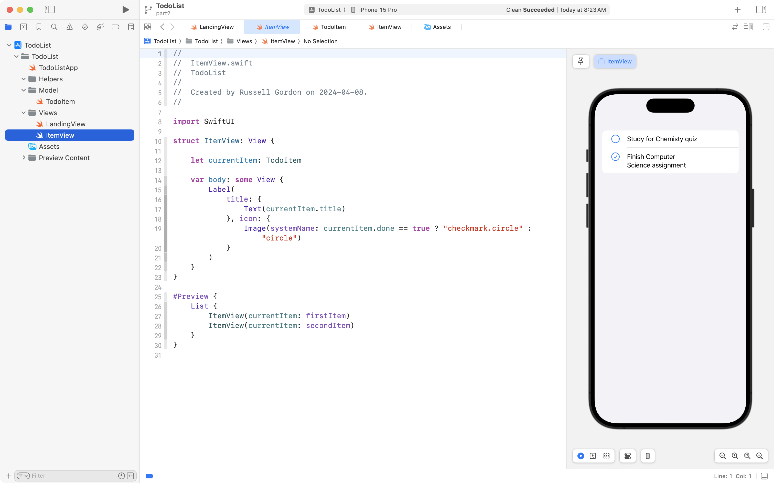 A helper view named ItemView should exist. It’s job is to show the user interface for a single to-do item: