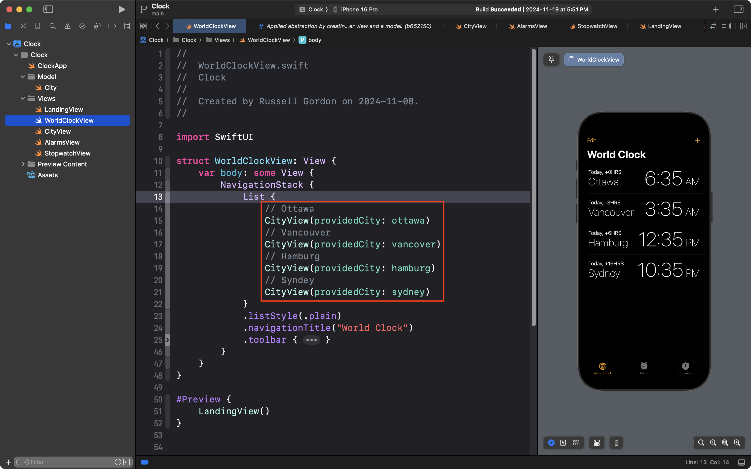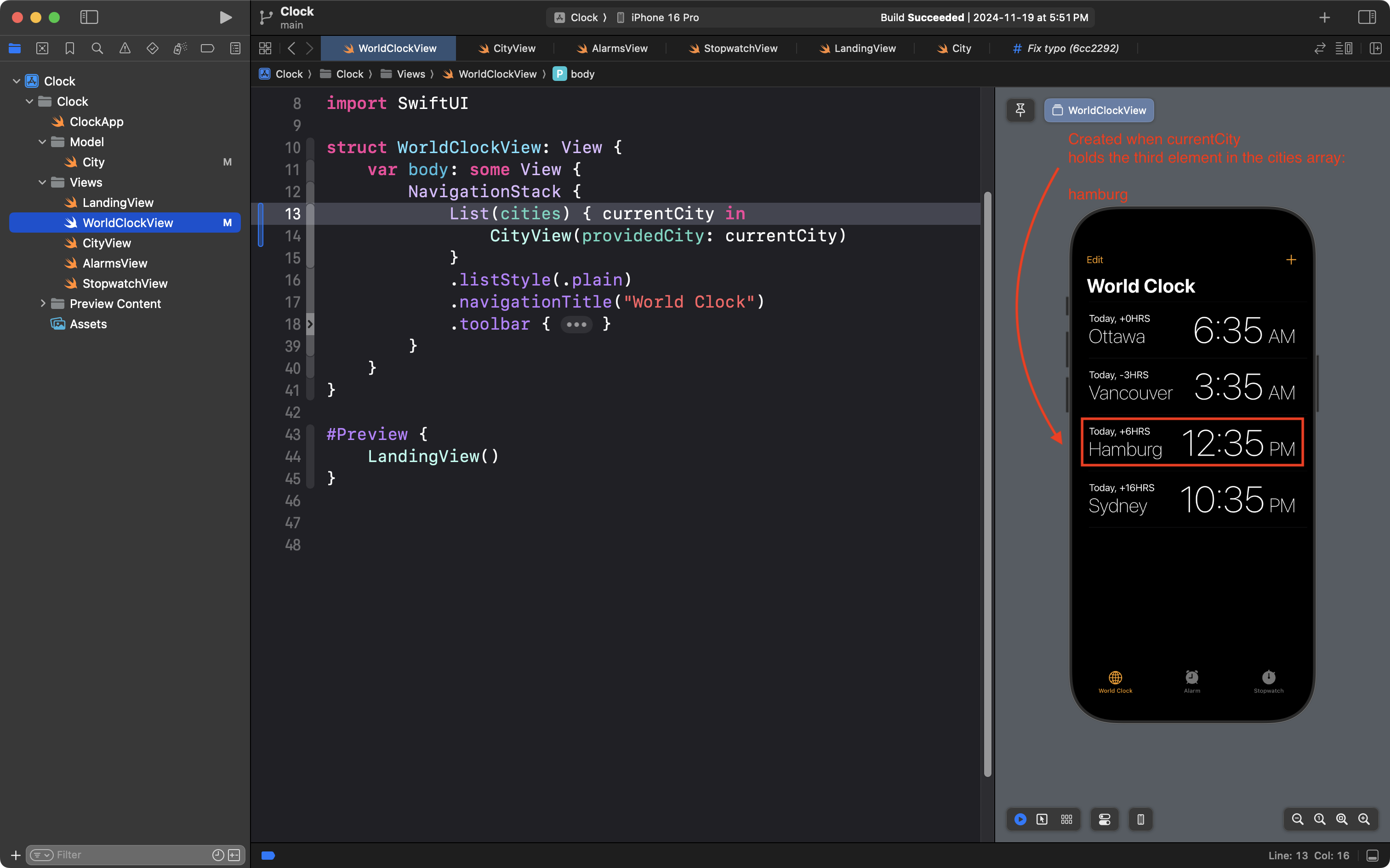 We’d then finish by creating a view that shows a scrollable list, and uses the List structure to iterate over the elements of the boardingHouses array:
