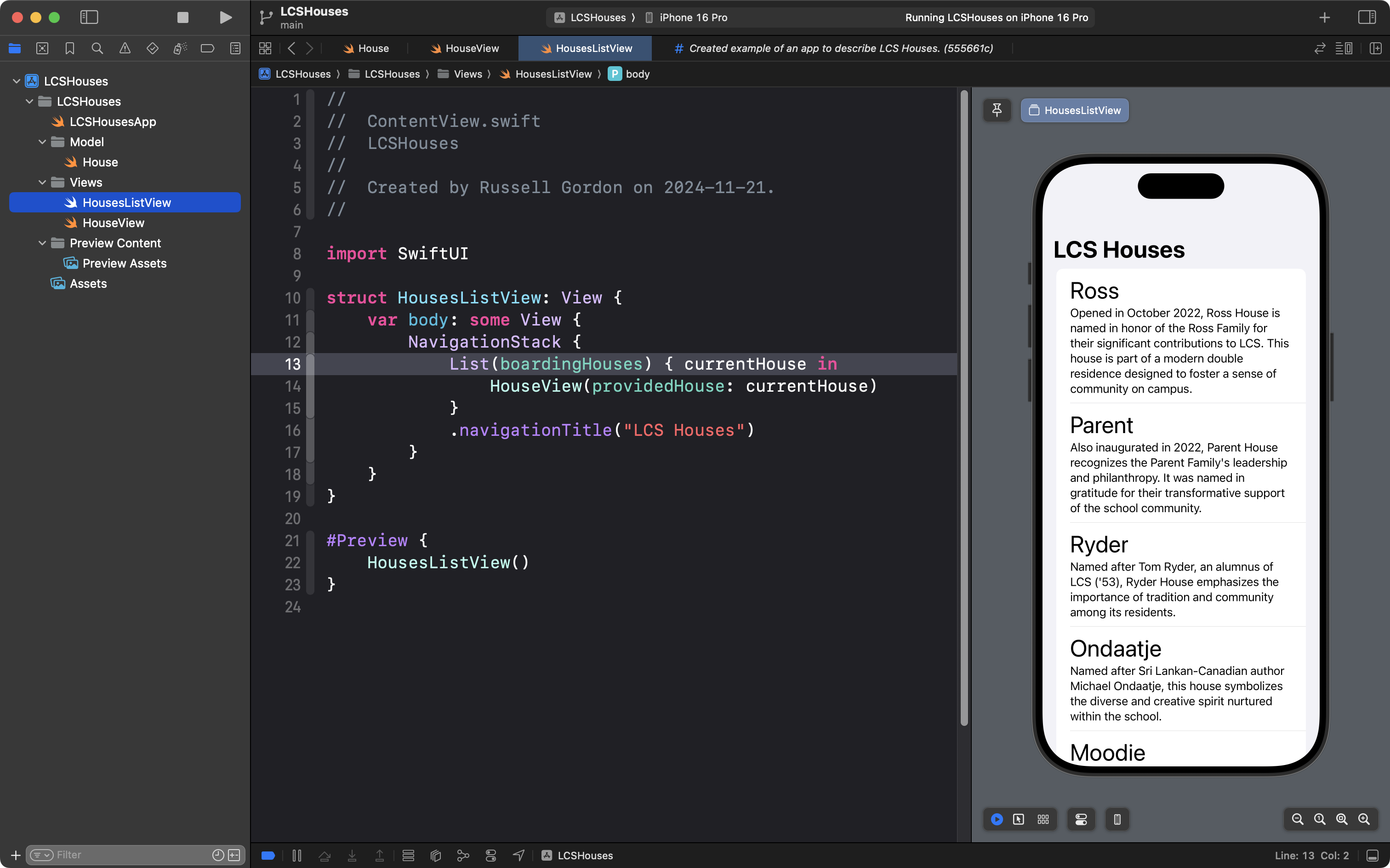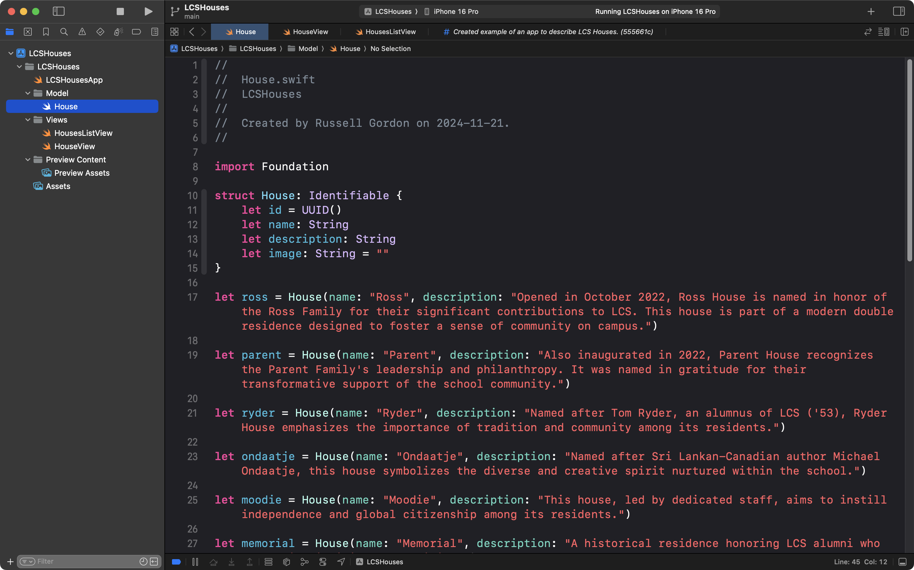let ross = House(name: "Ross", description: "Opened in October 2022, Ross House is named in honor of the Ross Family for their significant contributions to LCS. This house is part of a modern double residence designed to foster a sense of community on campus.")