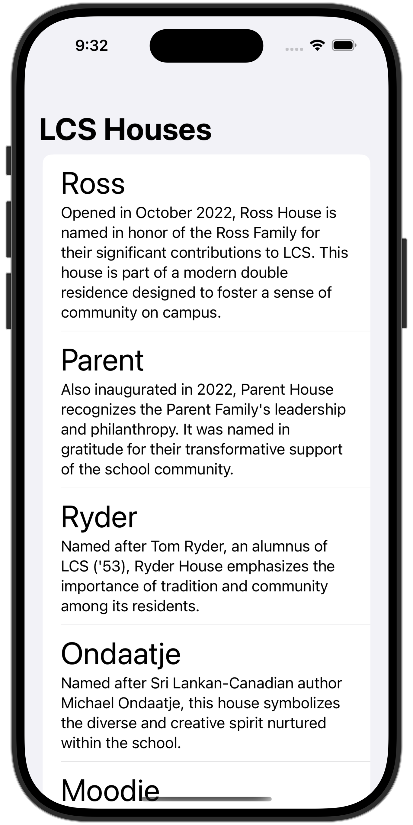 Say that we wanted to create an app to browse details of the boarding houses here at Lakefield College School: