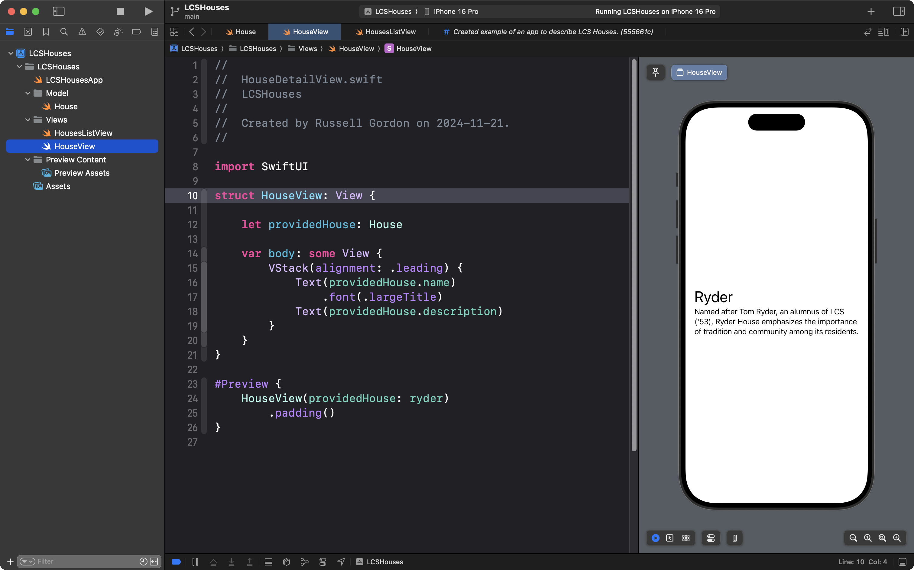 let ryder = House(name: "Ryder", description: "Named after Tom Ryder, an alumnus of LCS ('53), Ryder House emphasizes the importance of tradition and community among its residents.")