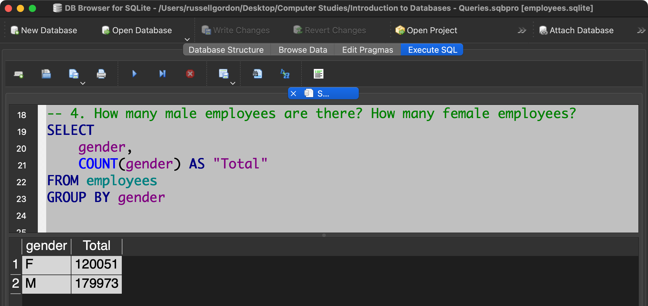 GROUP BYclause together with theCOUNTfunction allows us to obtain a subtotal for each unique value found in thegendercolumn.