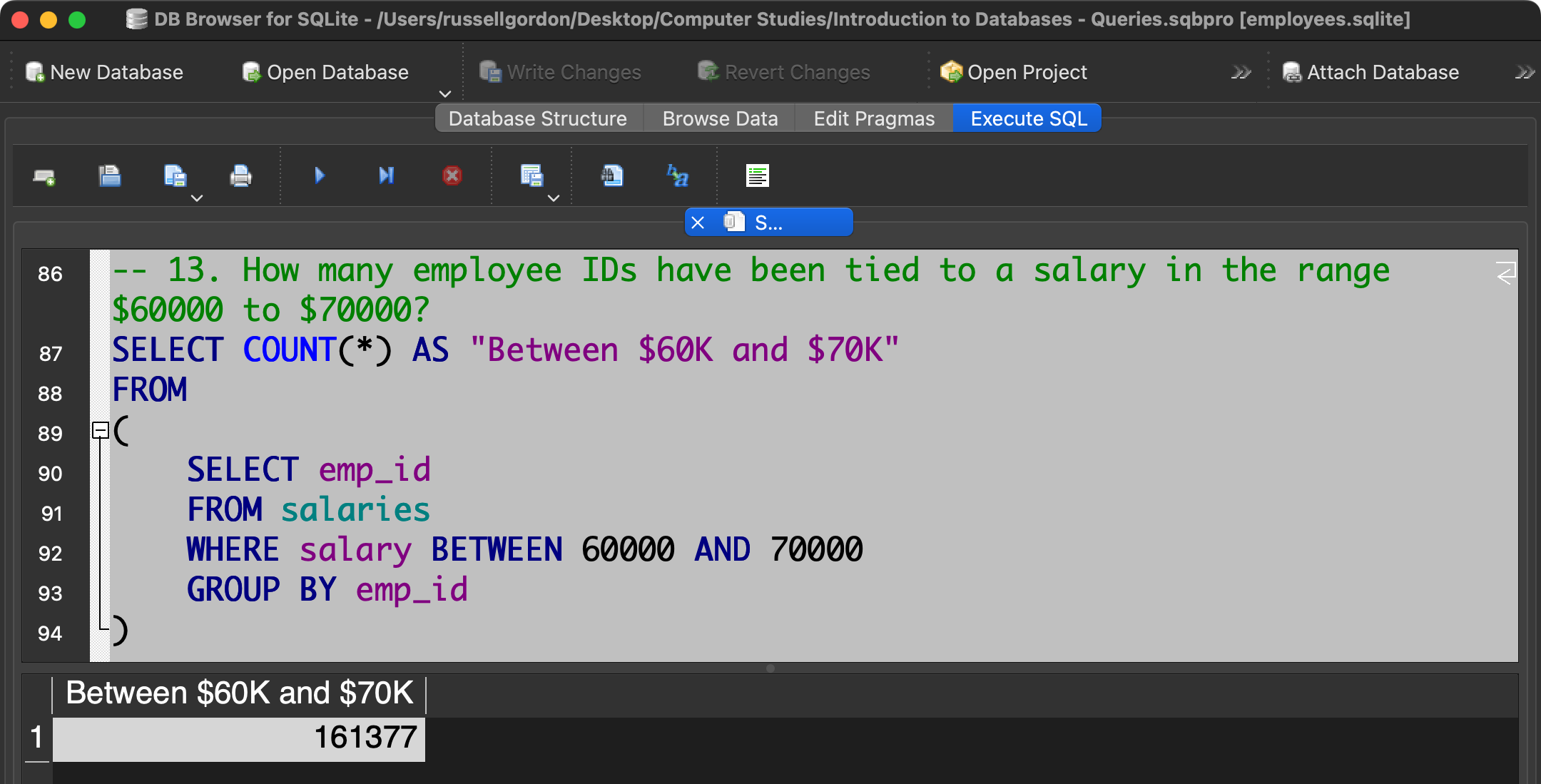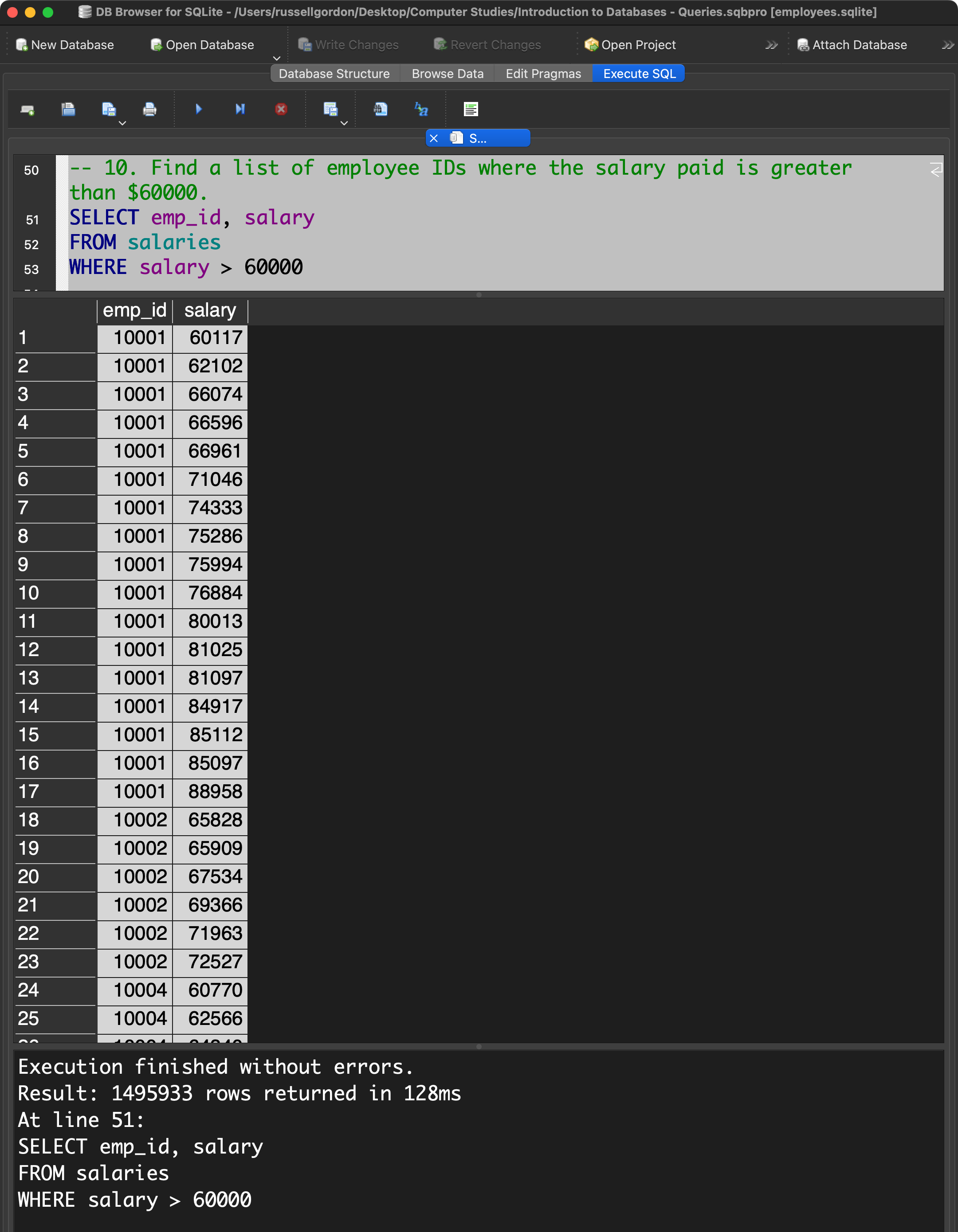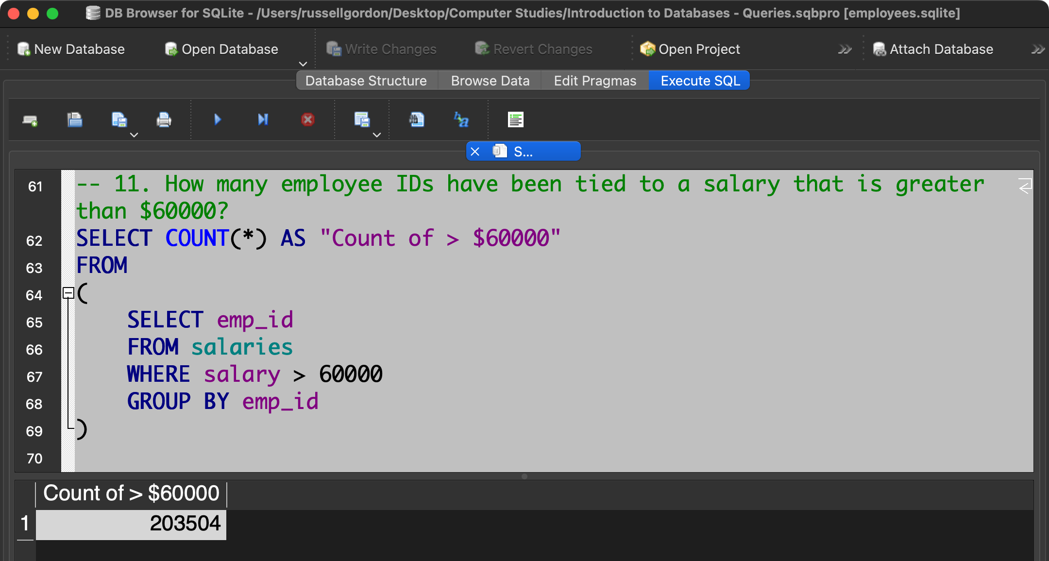 First – with the innermost query – the sub-query – we find the list of unique employee ID’s tied to at least one salary that was greater than $60000.