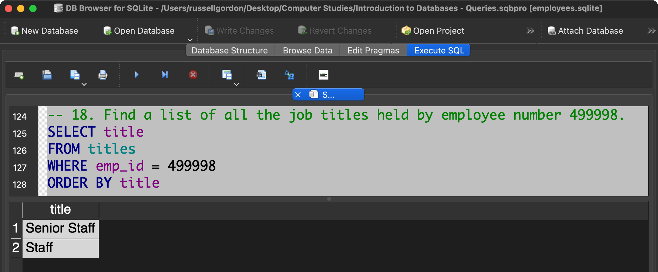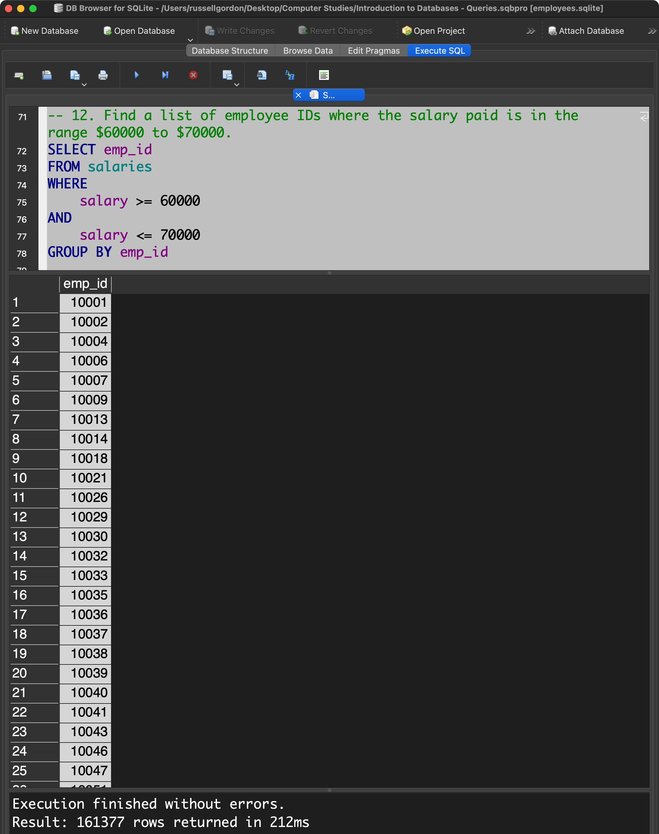 SELECTsalaryFROM salariesWHERE emp_id = 10012You will see the set of rows showing all salaries that have been tied to employee ID 10012.