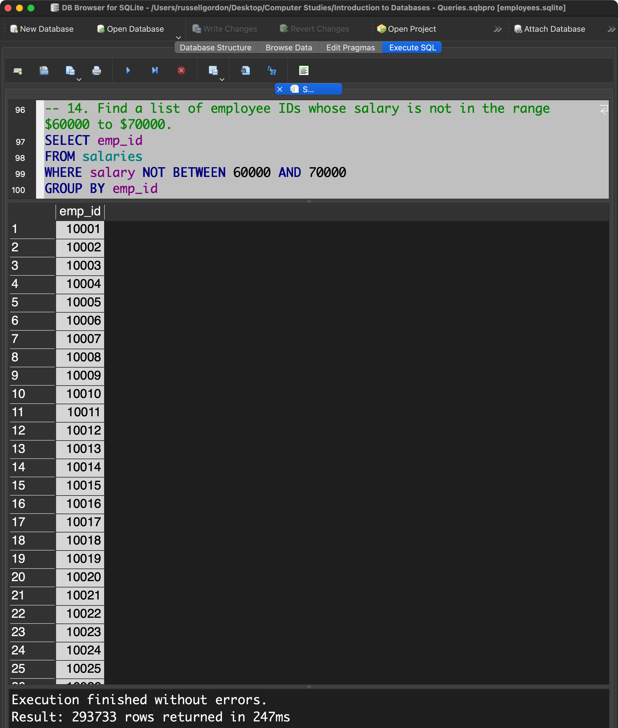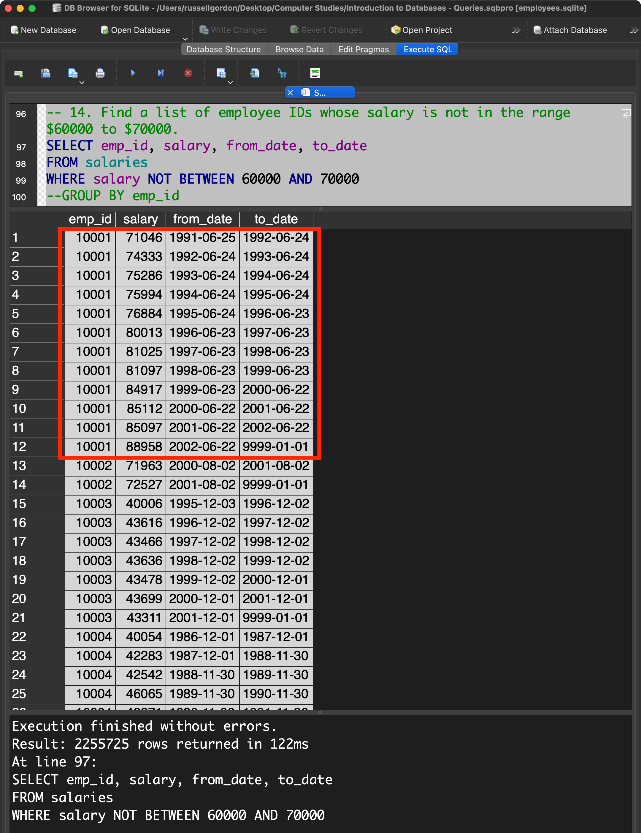 NOTkeyword provides the logical inverse of the set of rows returned by the query from question #12.At first glance, the results above may seem incorrect.