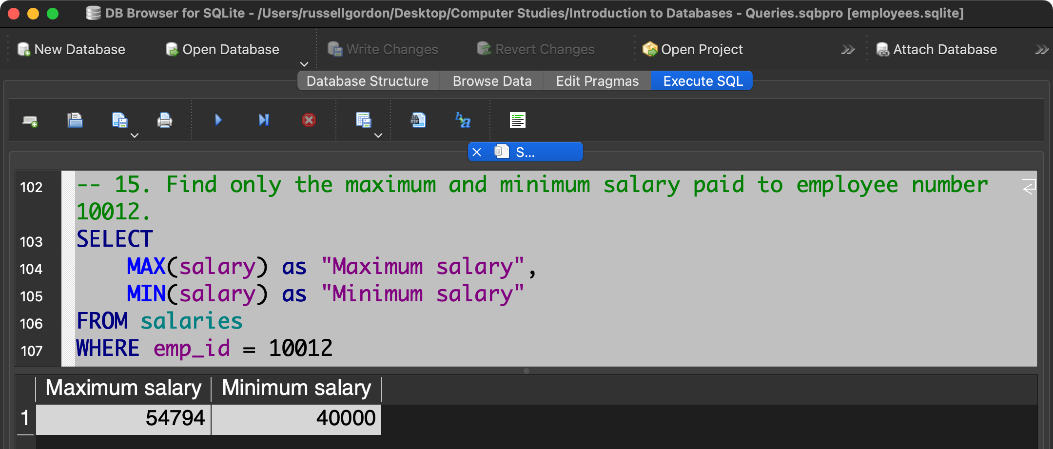 MAXandMINfunctions to the query, we are picking out only the highest and lowest values in the list of rows returned by the simpler query.