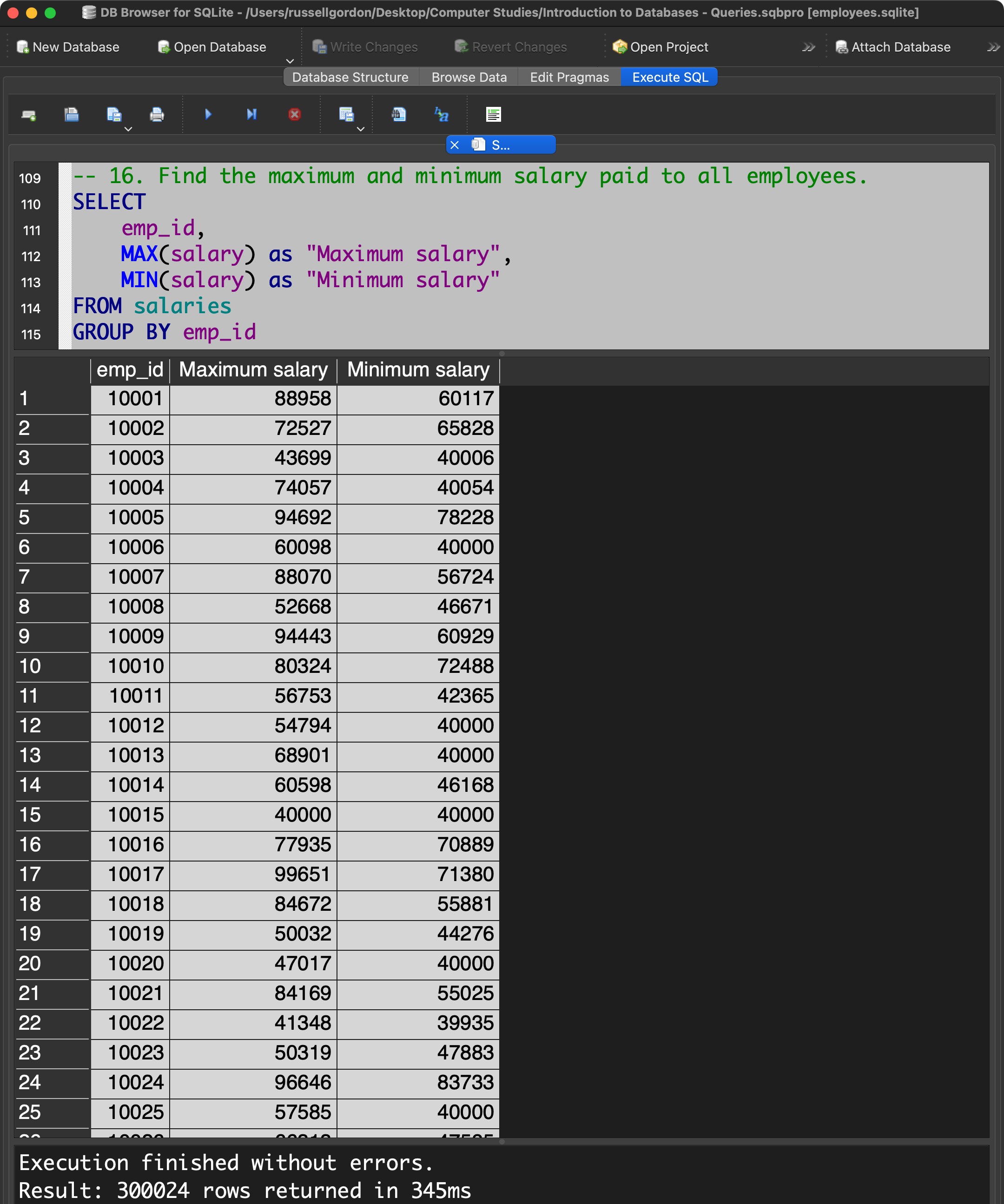GROUP BYclause on theemp_idcolumn, we are telling the database to give us the maximum and minimum salary for each individual employee at the company.