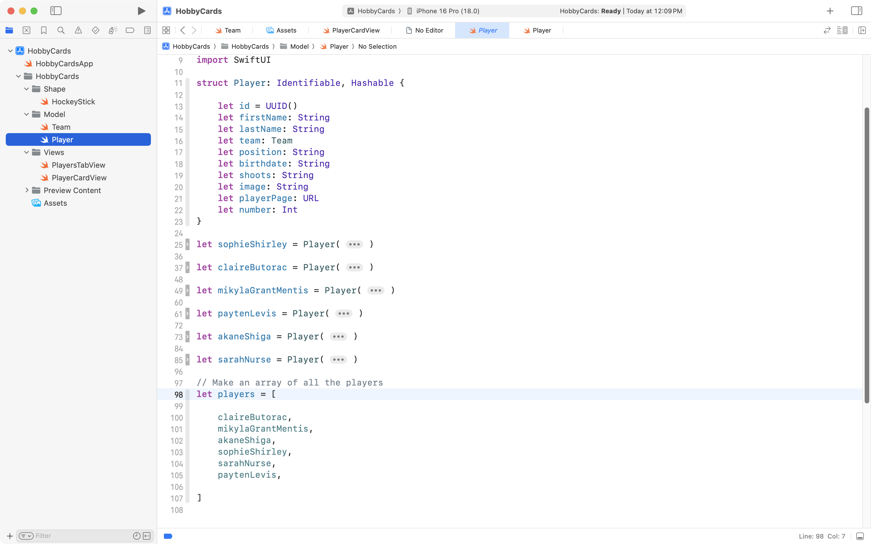 The use of an array allowed Mr. Gordon to apply abstraction and create his exemplar for the Hobby Cards task, where users can swipe through a list of players in the PWHL: