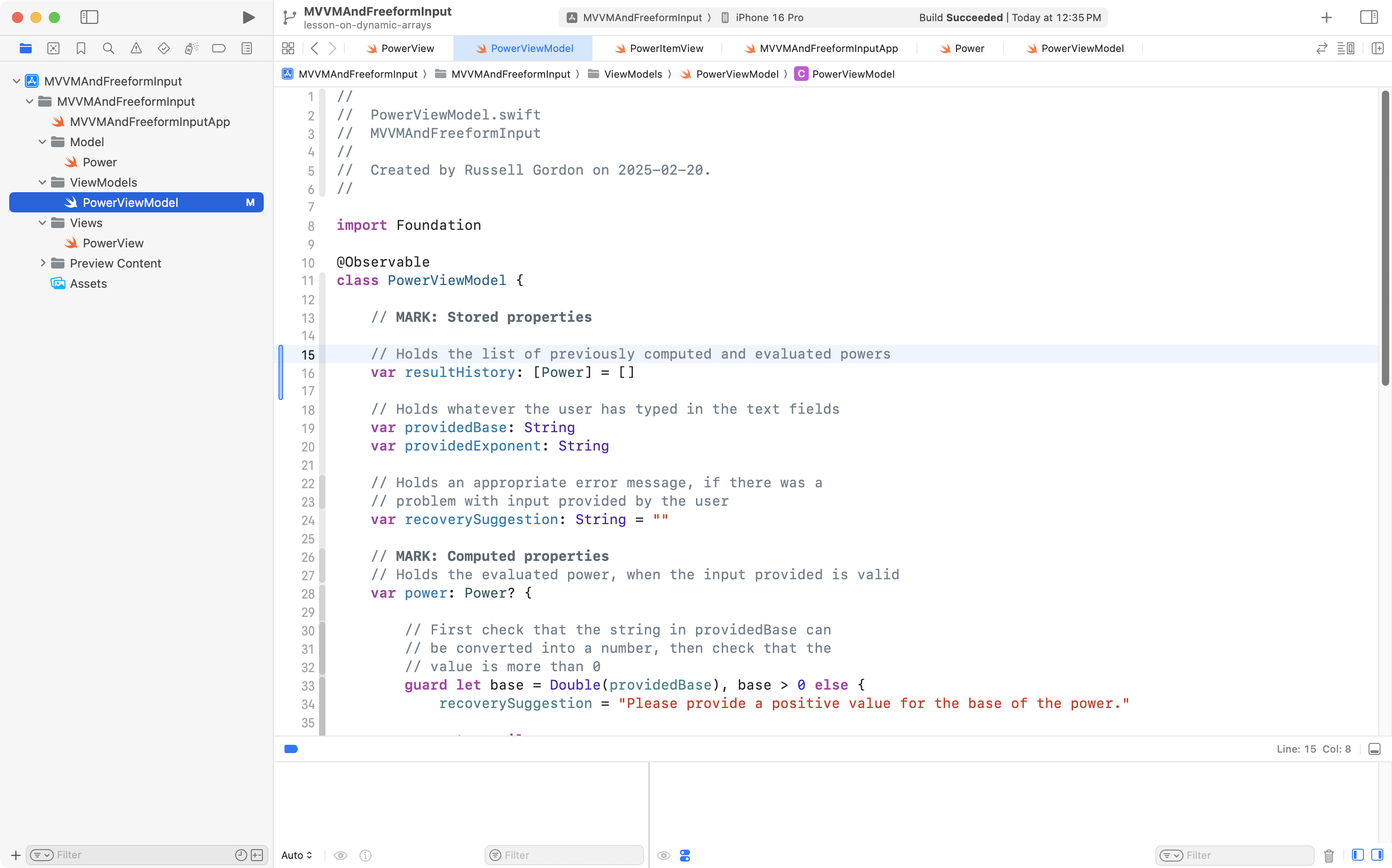 PowerItemView has one parameter, or question, that must be answered for it to do it’s job – what power should it display? We are telling it to display an instance of the Power structure with a base of 3 and an exponent of 2.