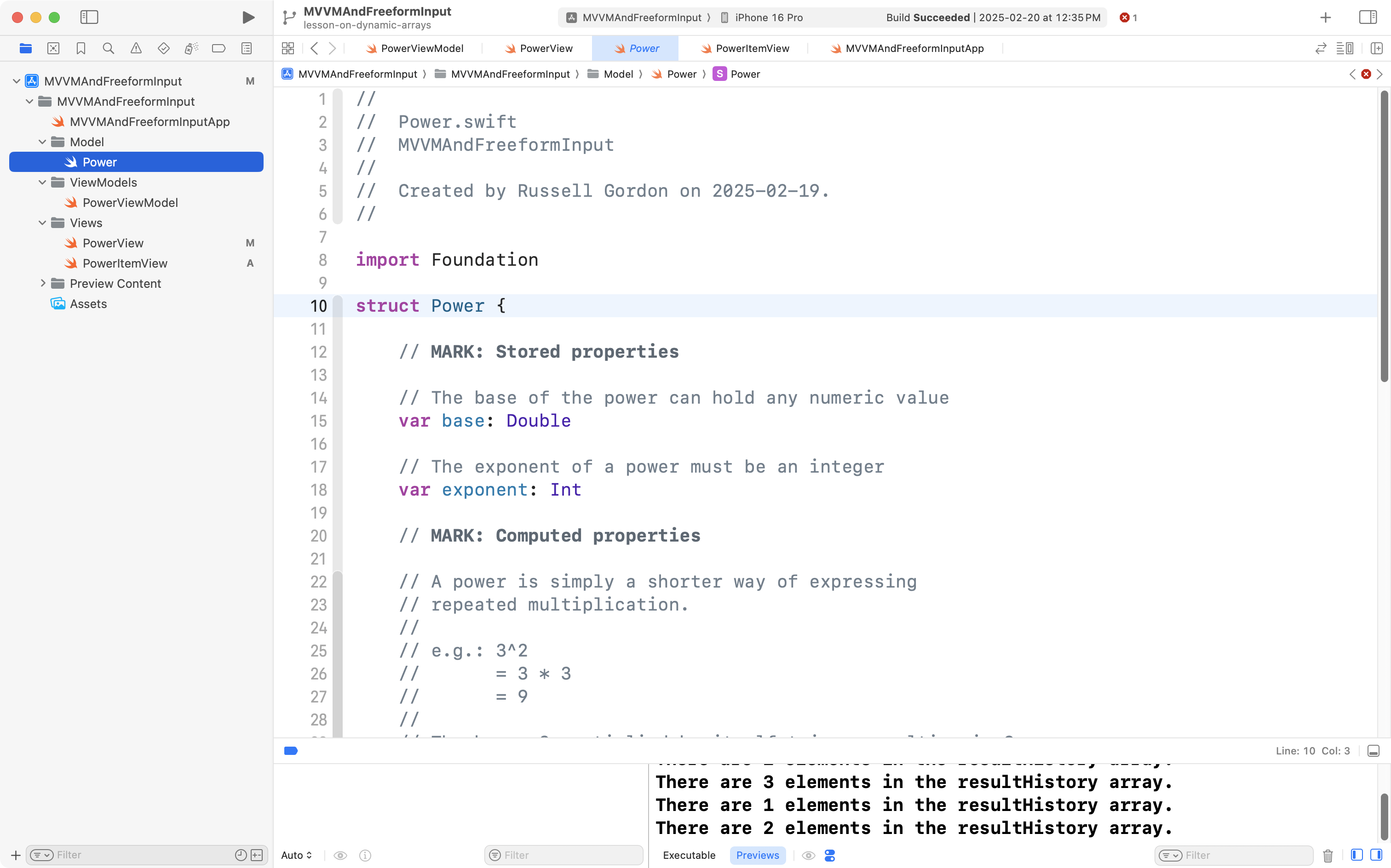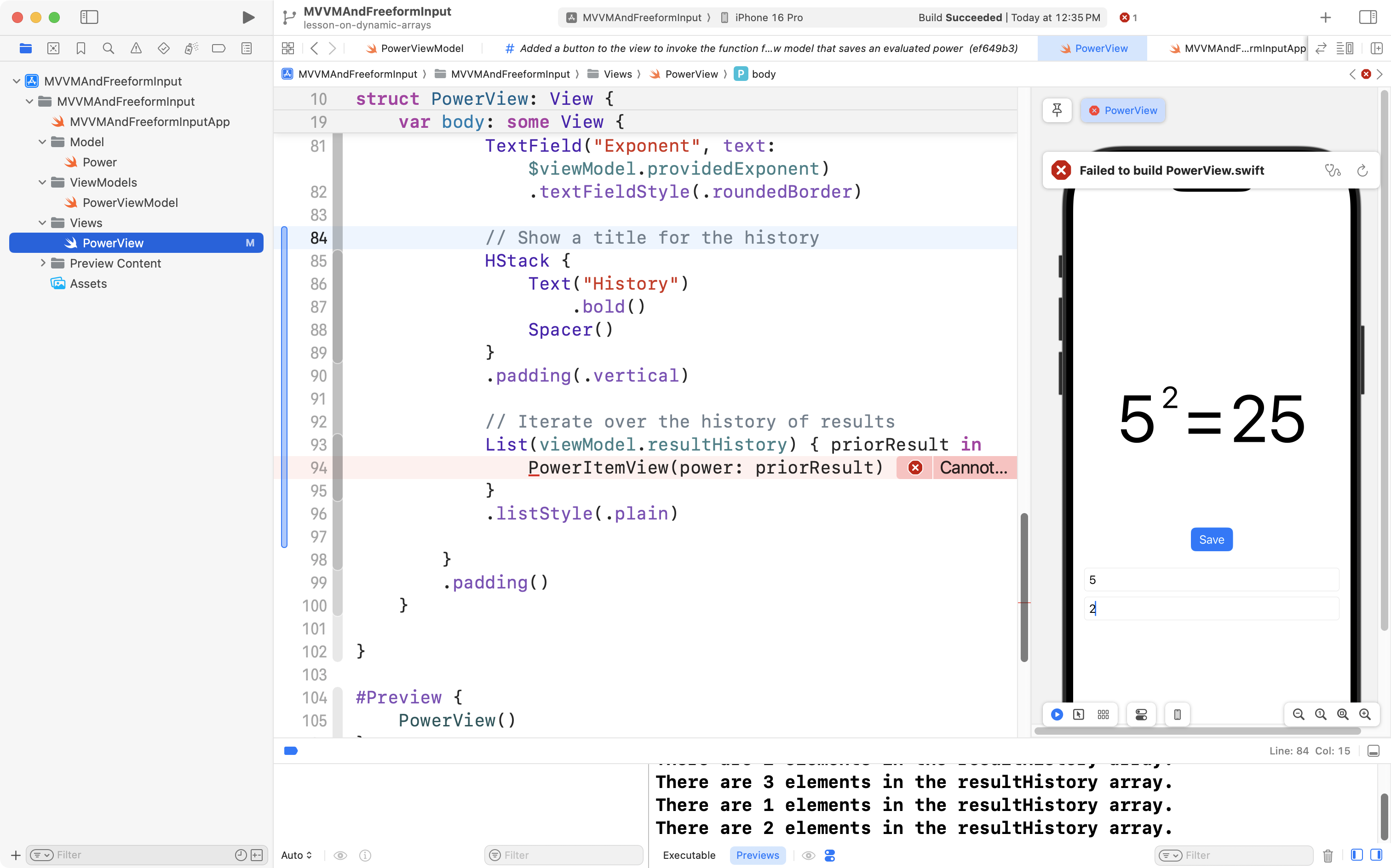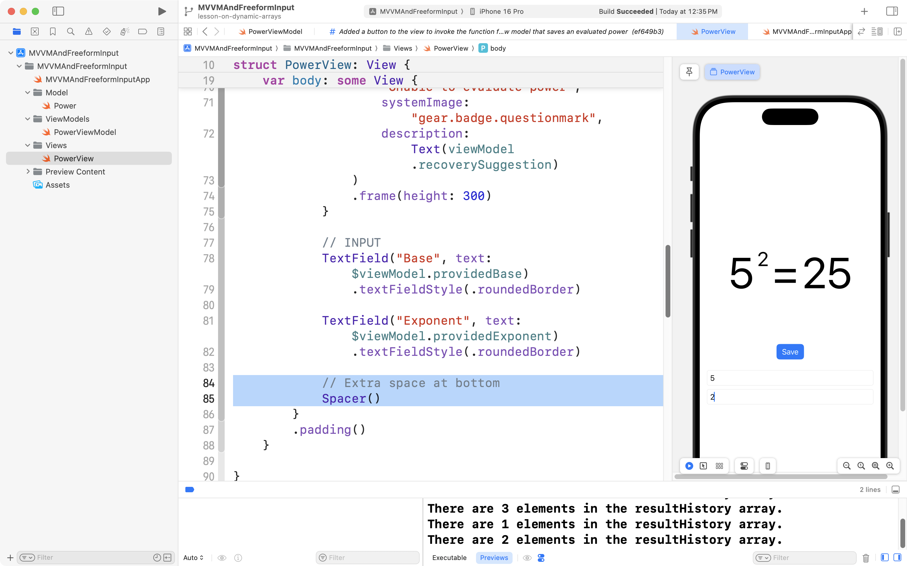 Now try typing in a power, and then saving the evaluated result. You should see the count of elements in the view model’s resultHistory array increasing each time you press the button: