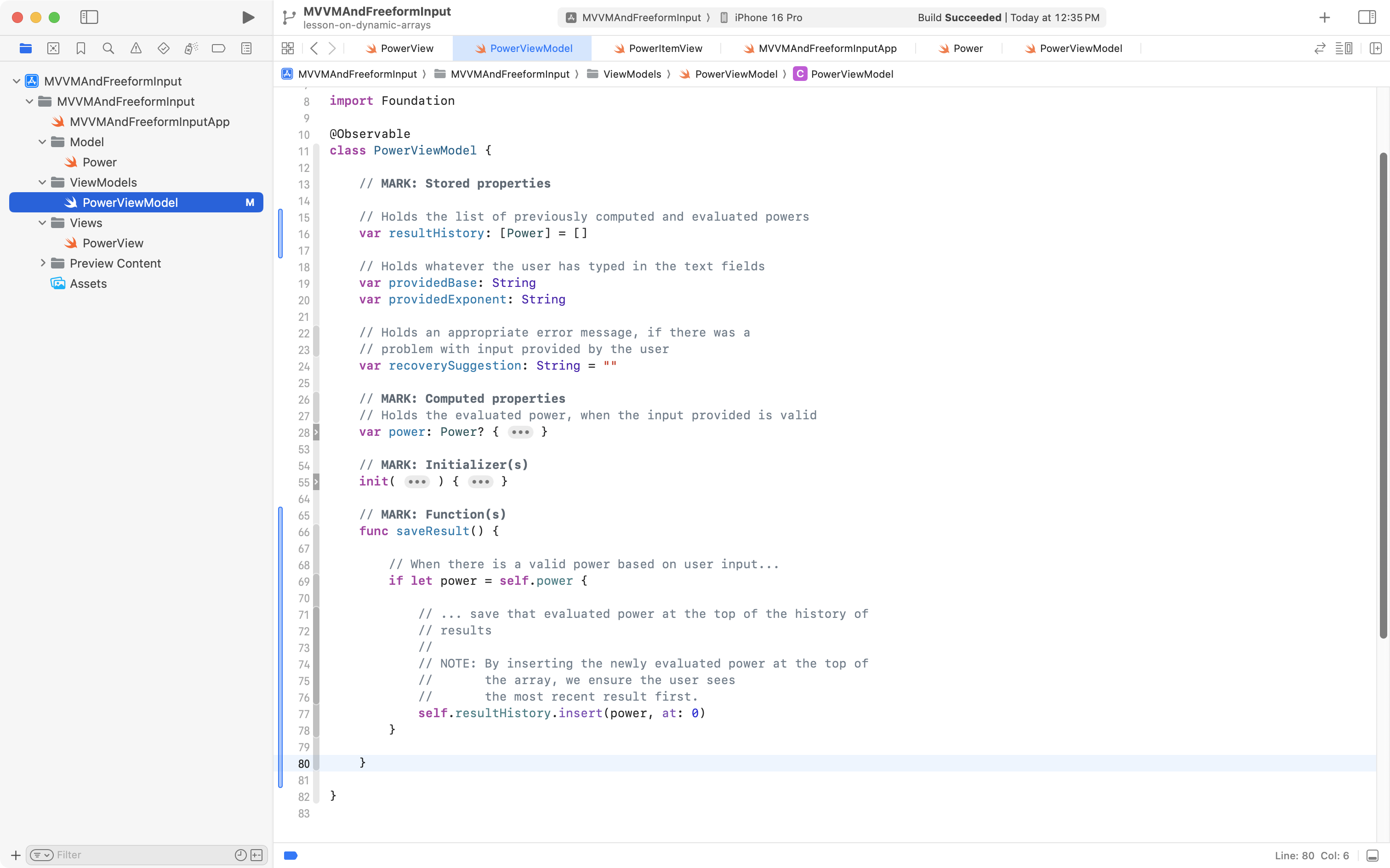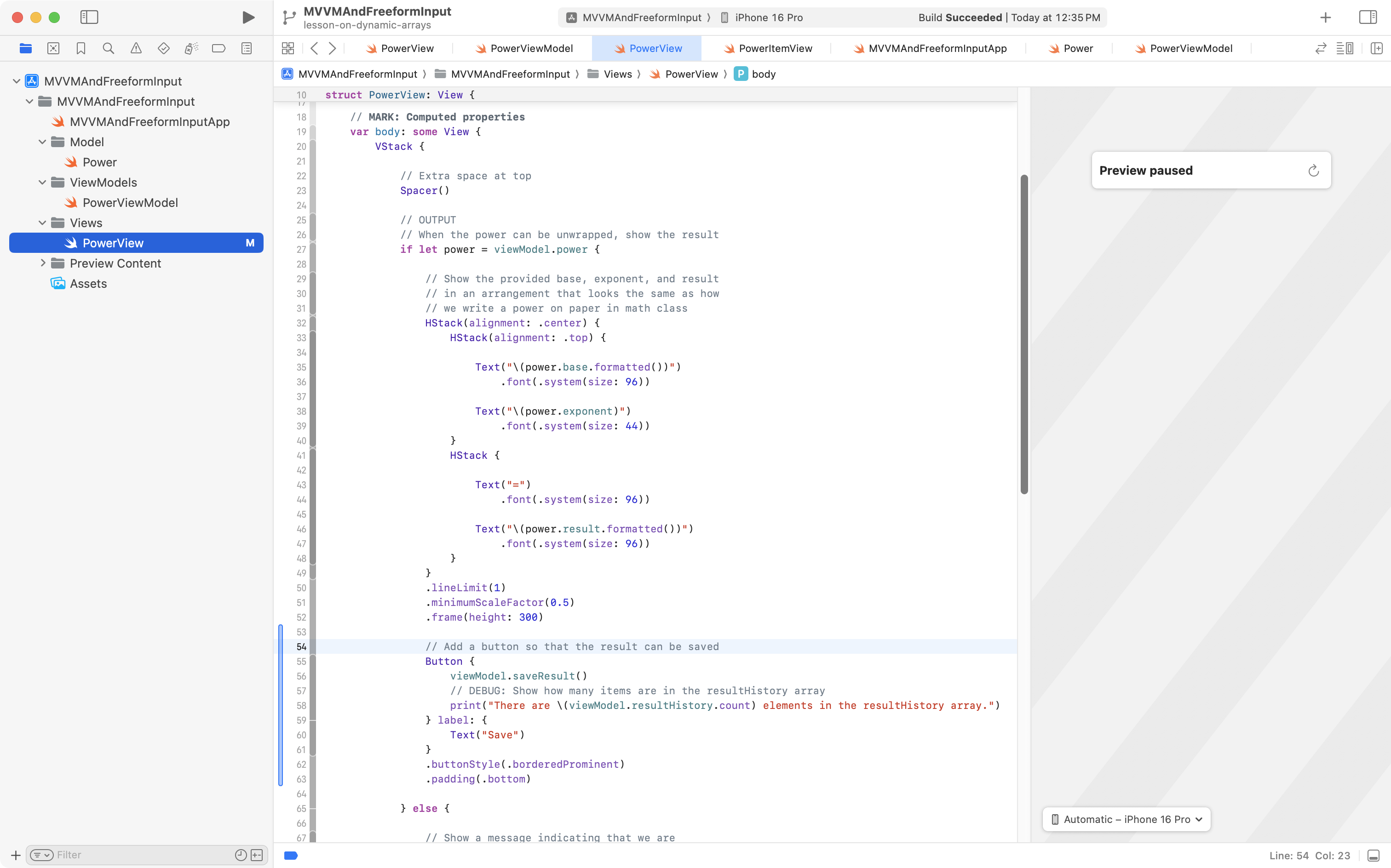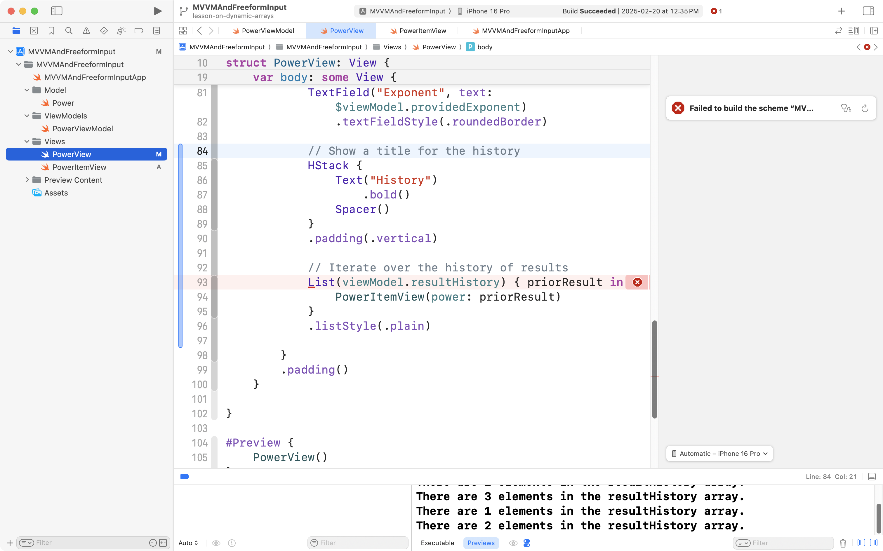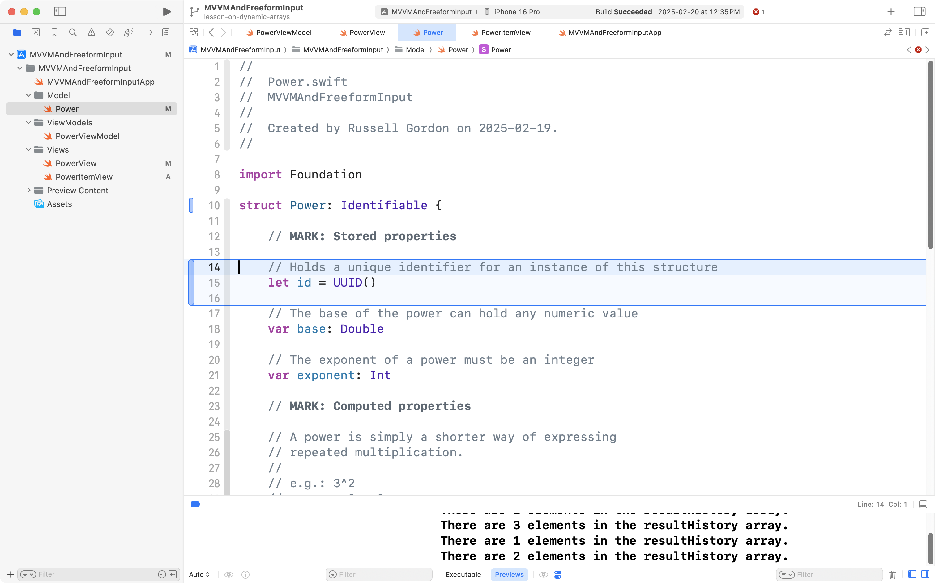 Now try typing in a power, and then saving the evaluated result. You should see the count of elements in the view model’s resultHistory array increasing each time you press the button: