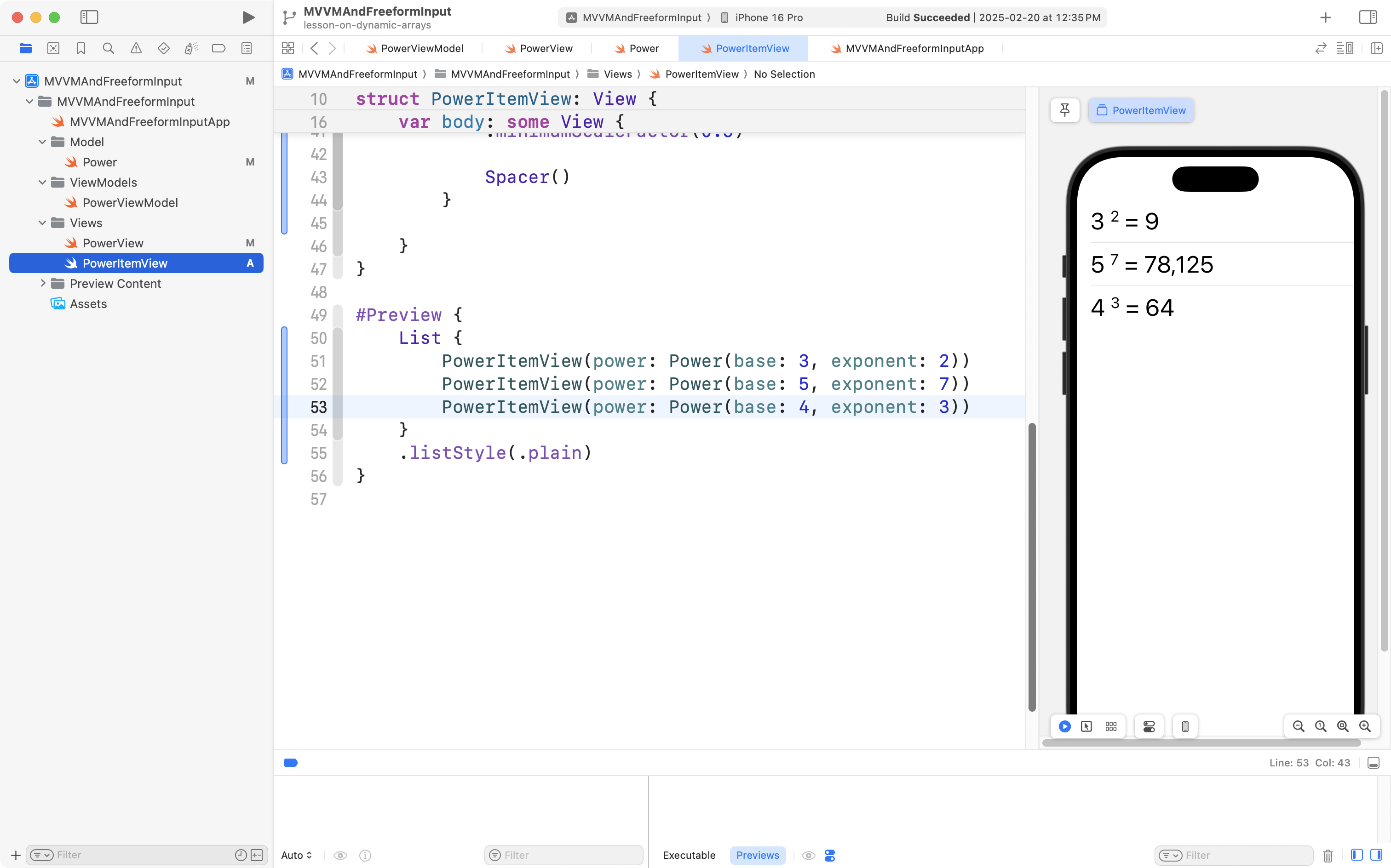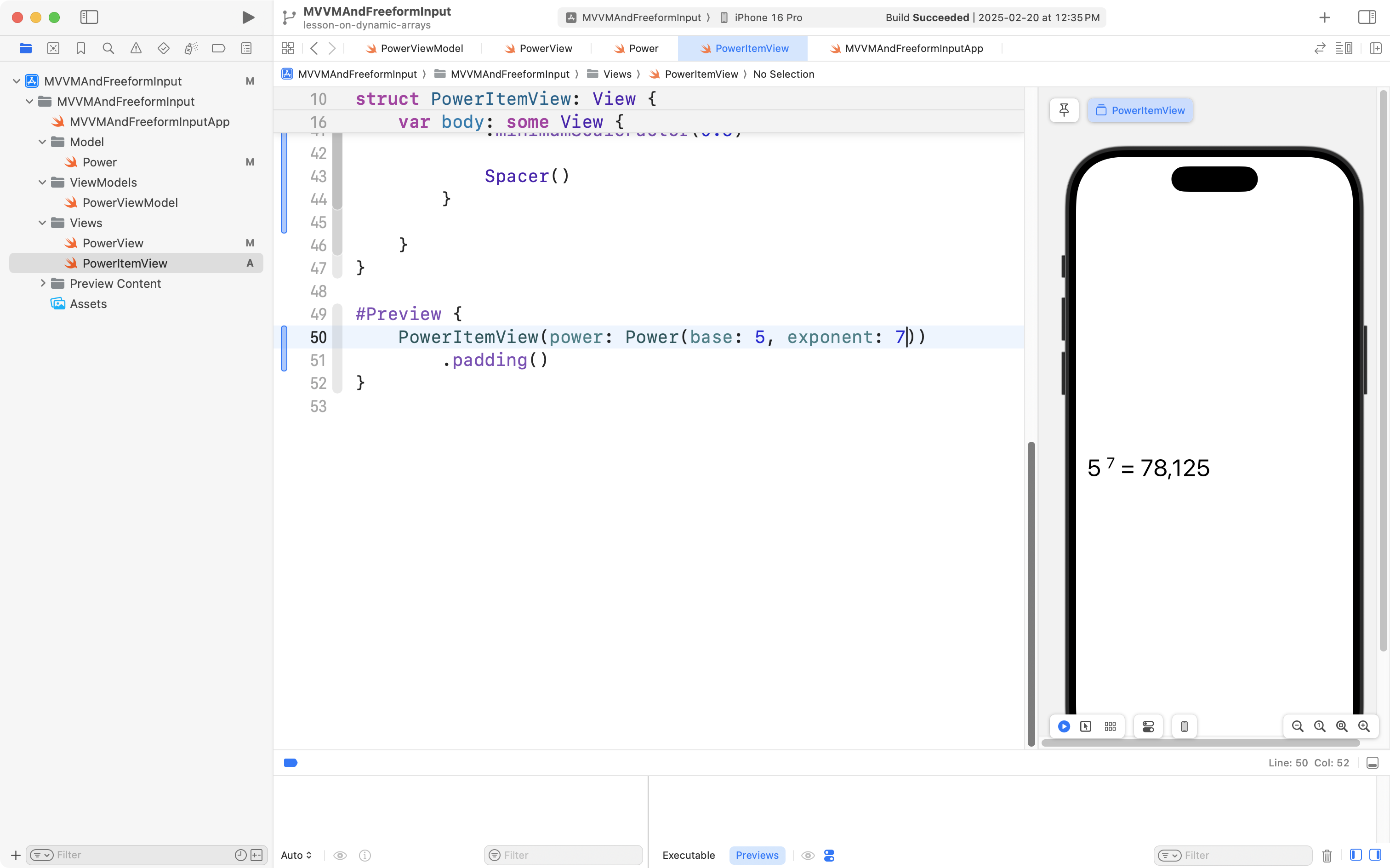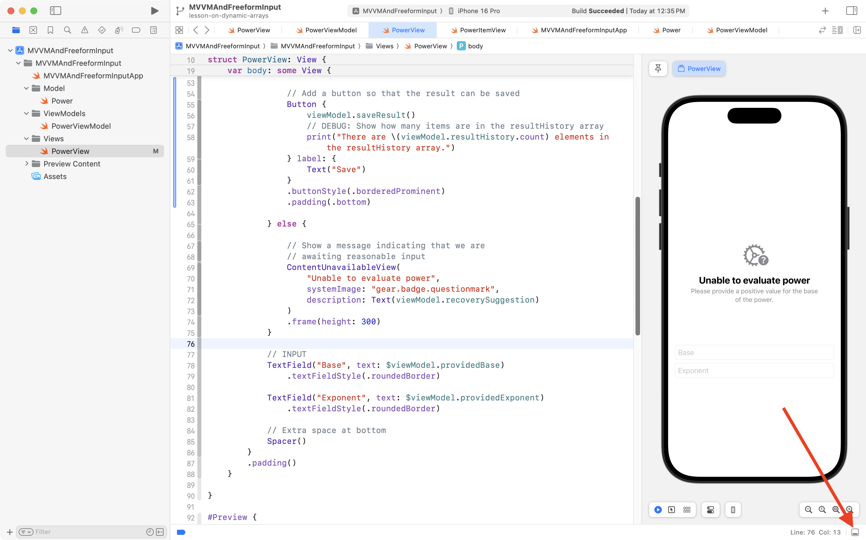 First, return to PowerItemView, and if necessary, press Option-Command-P to restart Xcode Previews: