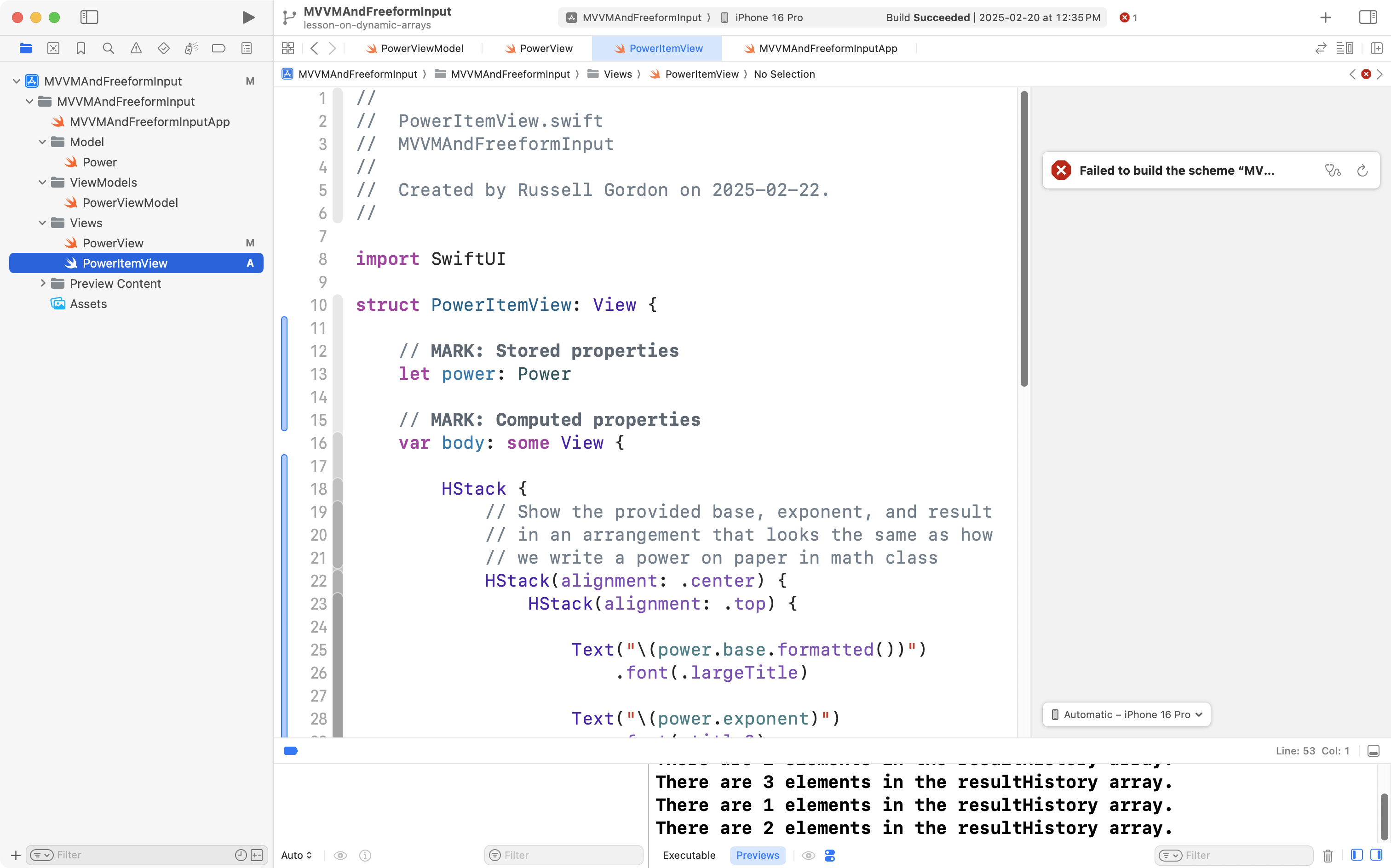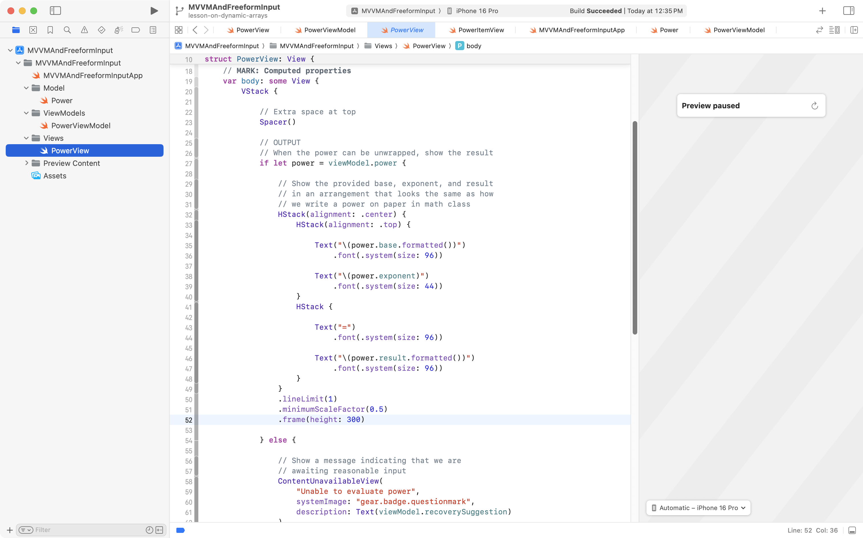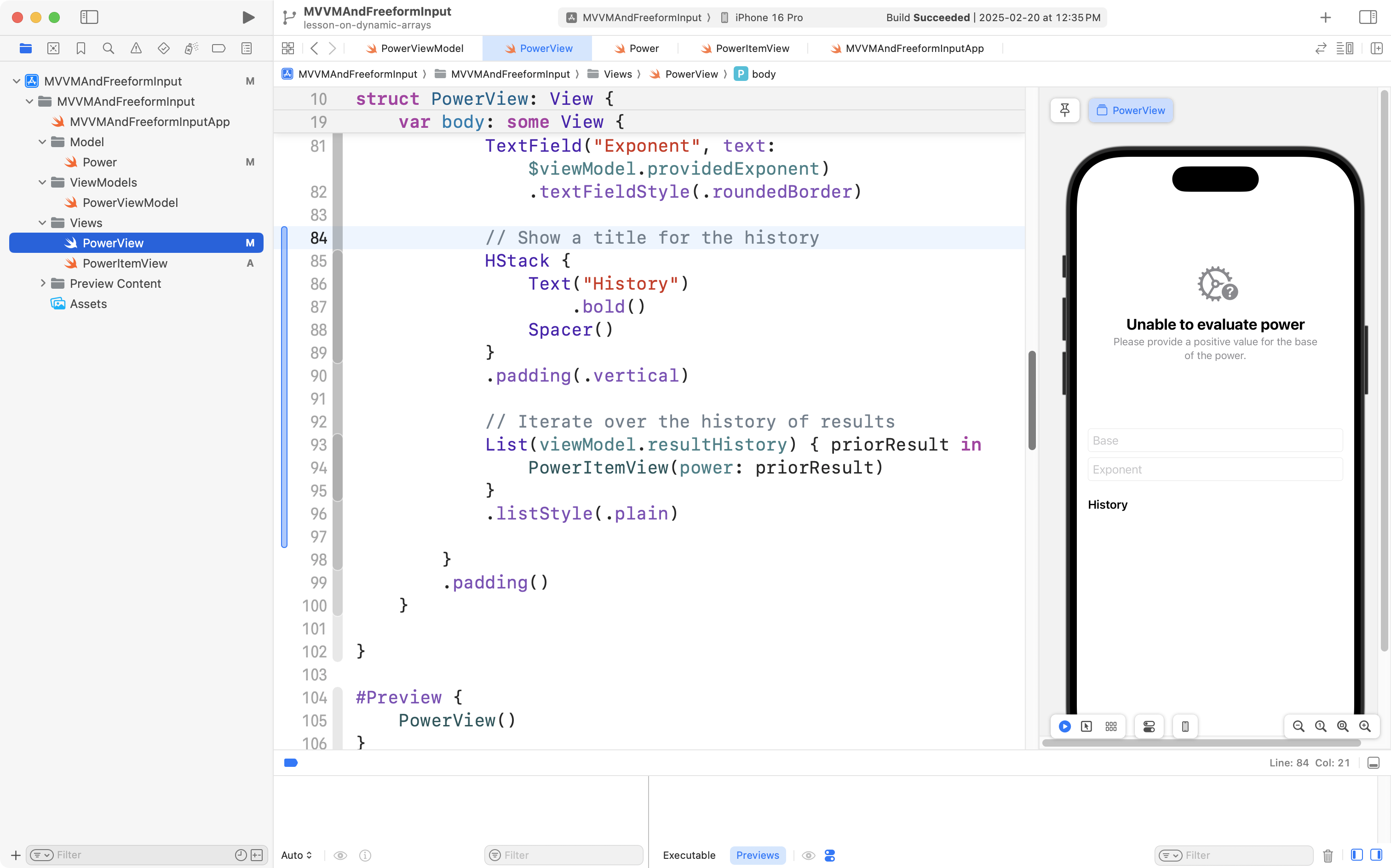 First, return to PowerItemView, and if necessary, press Option-Command-P to restart Xcode Previews: