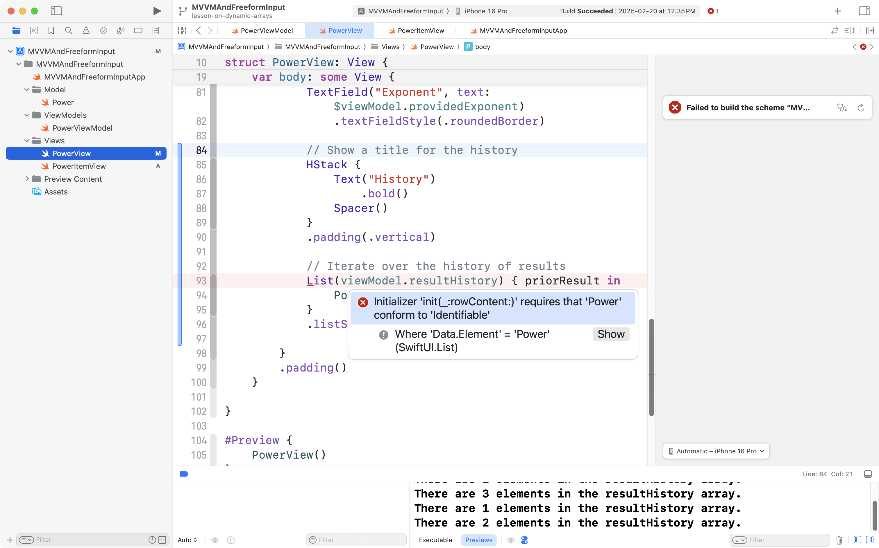 The problem is that our Power structure, in the model layer of our app, does not conform to the Identifiable protocol. Recall from earlier this year – any information shown in a scrollable list in a SwiftUI app must have a unique identifier.