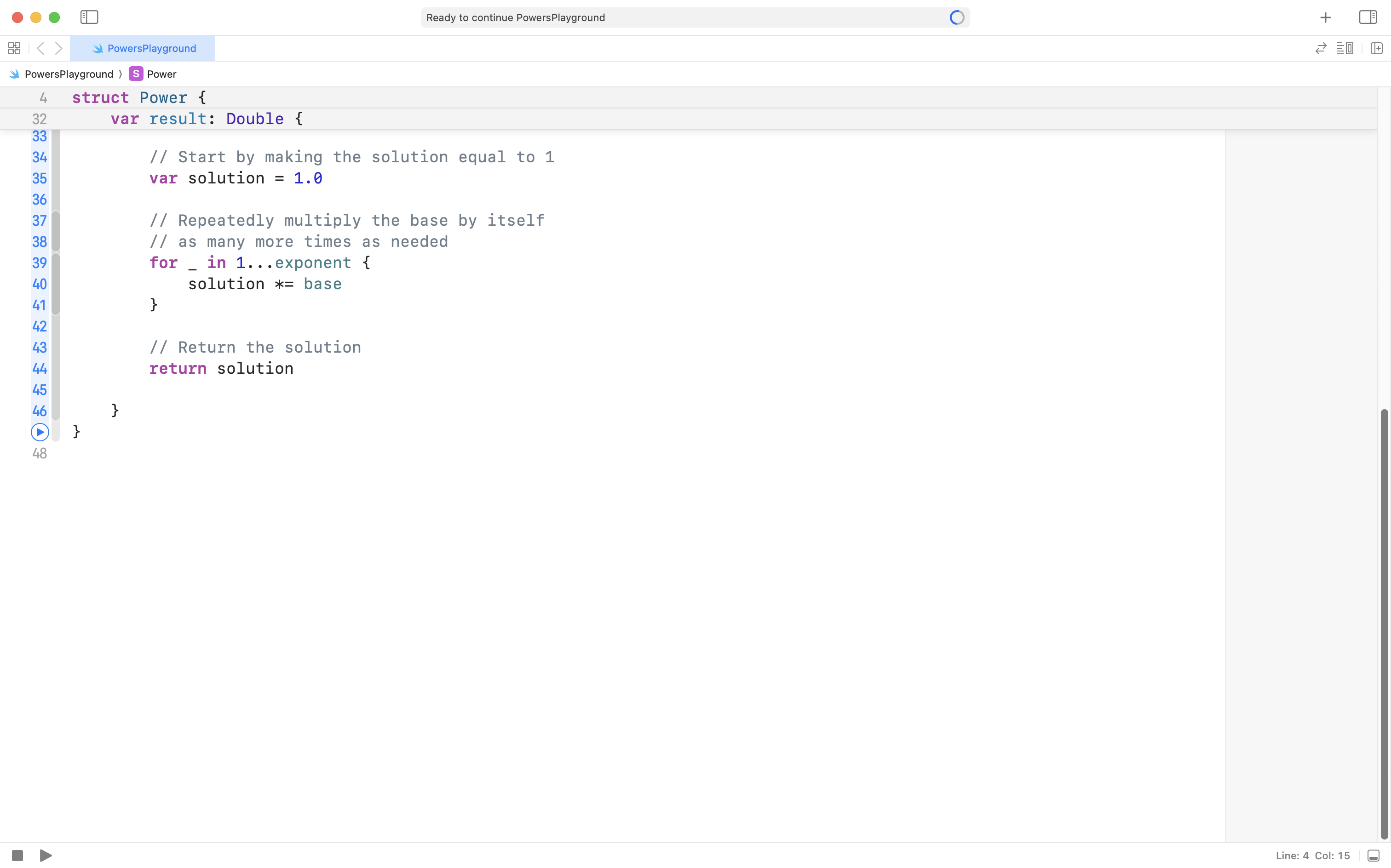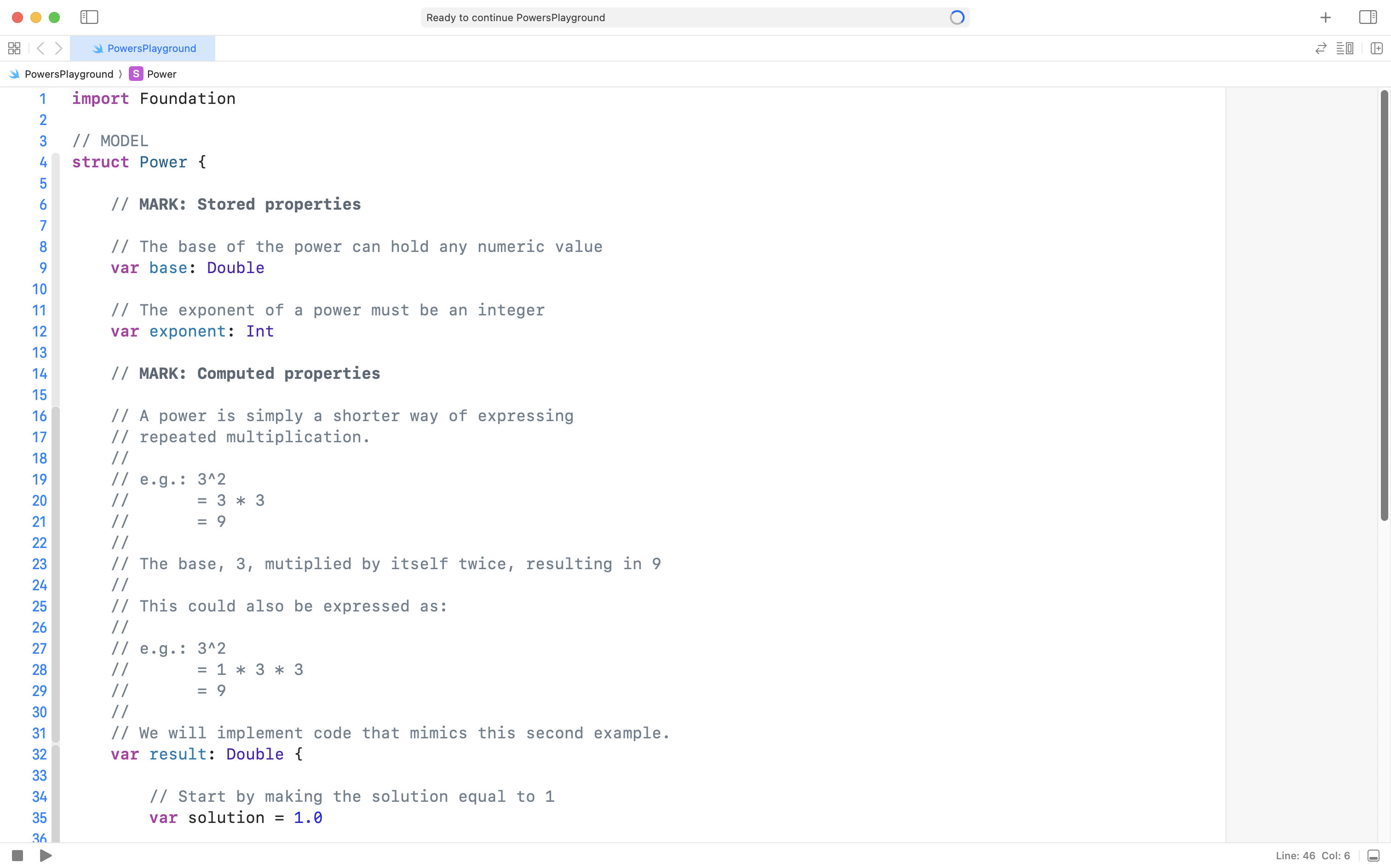 Add the following code to your Power structure, after the two stored properties, but before the closing curly bracket of the structure: