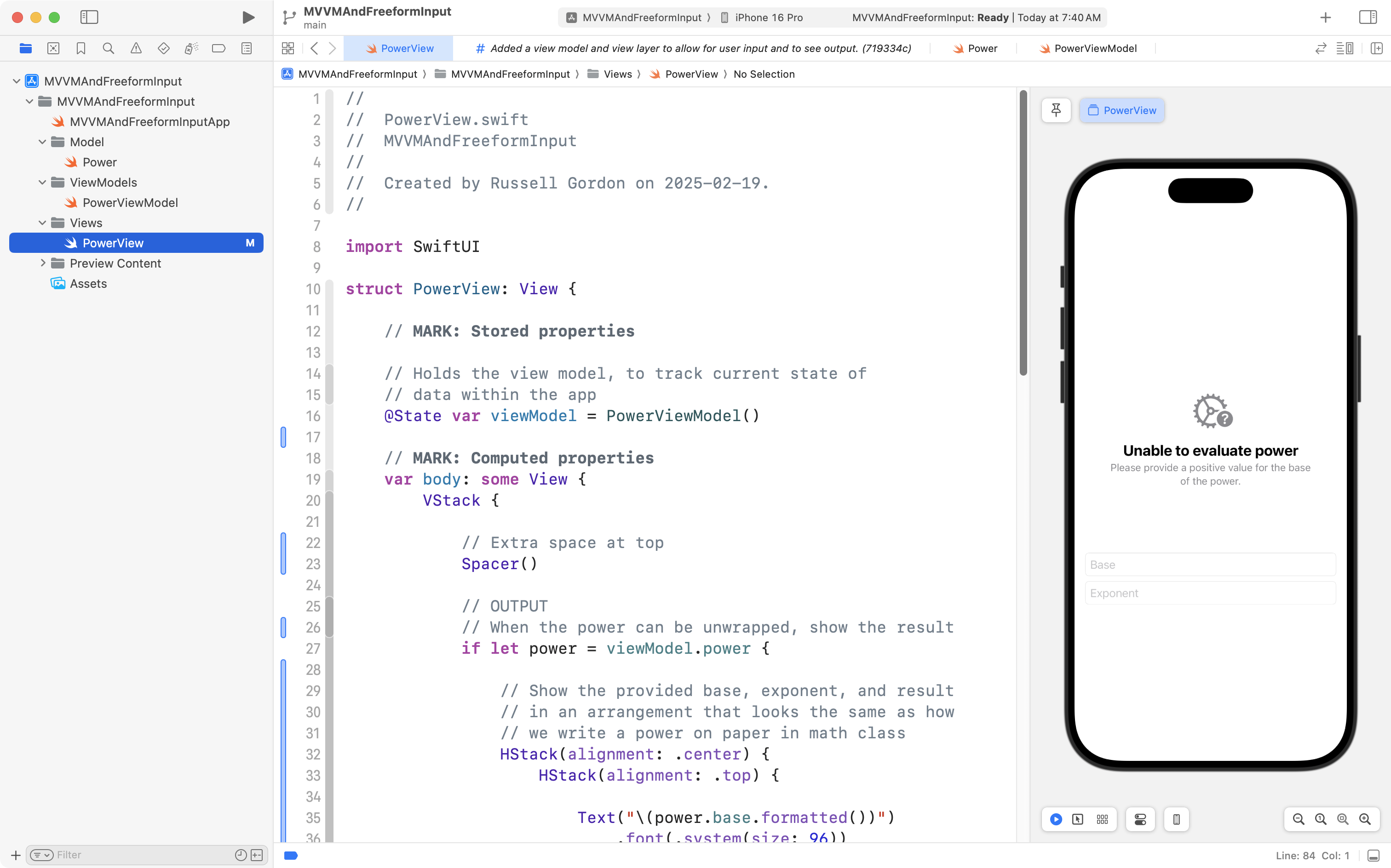 Make changes first to the view model, then to the view, to support the evaluation of powers with a negative base.