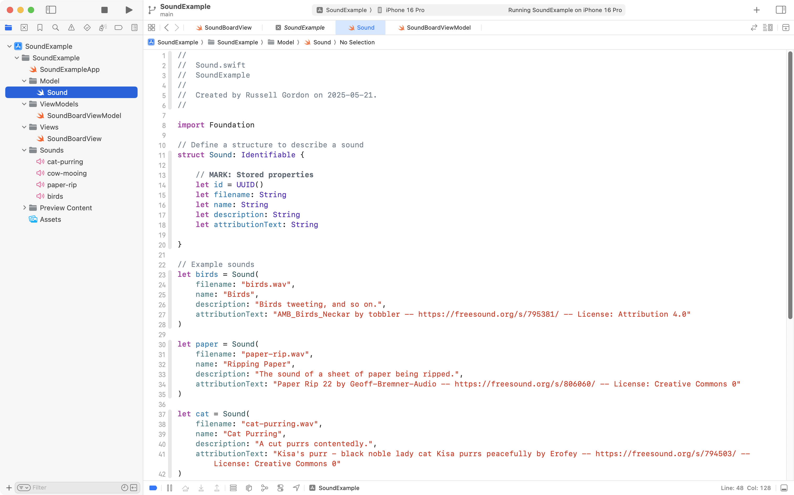 The app defines a structure named Sound which has five stored properties: