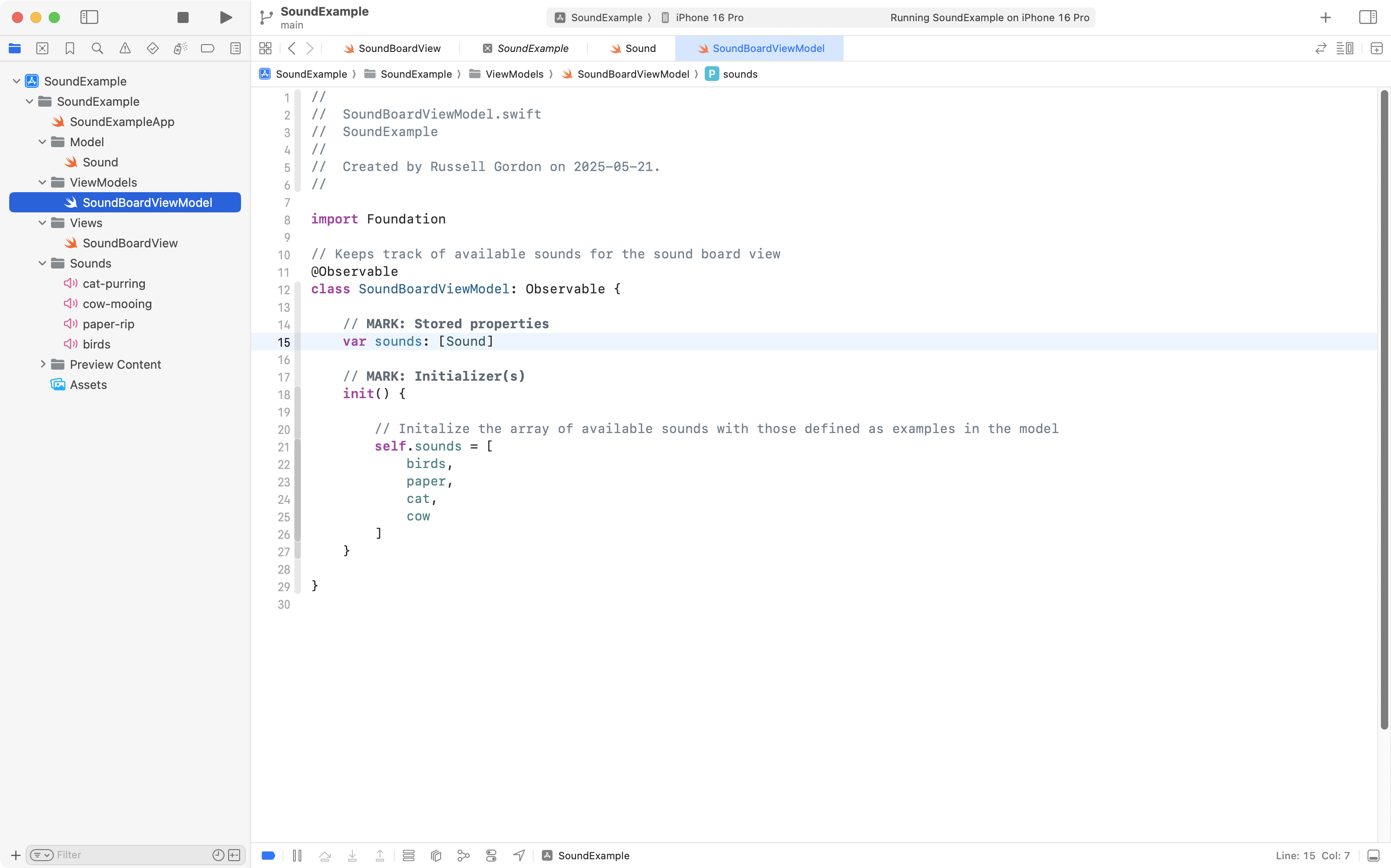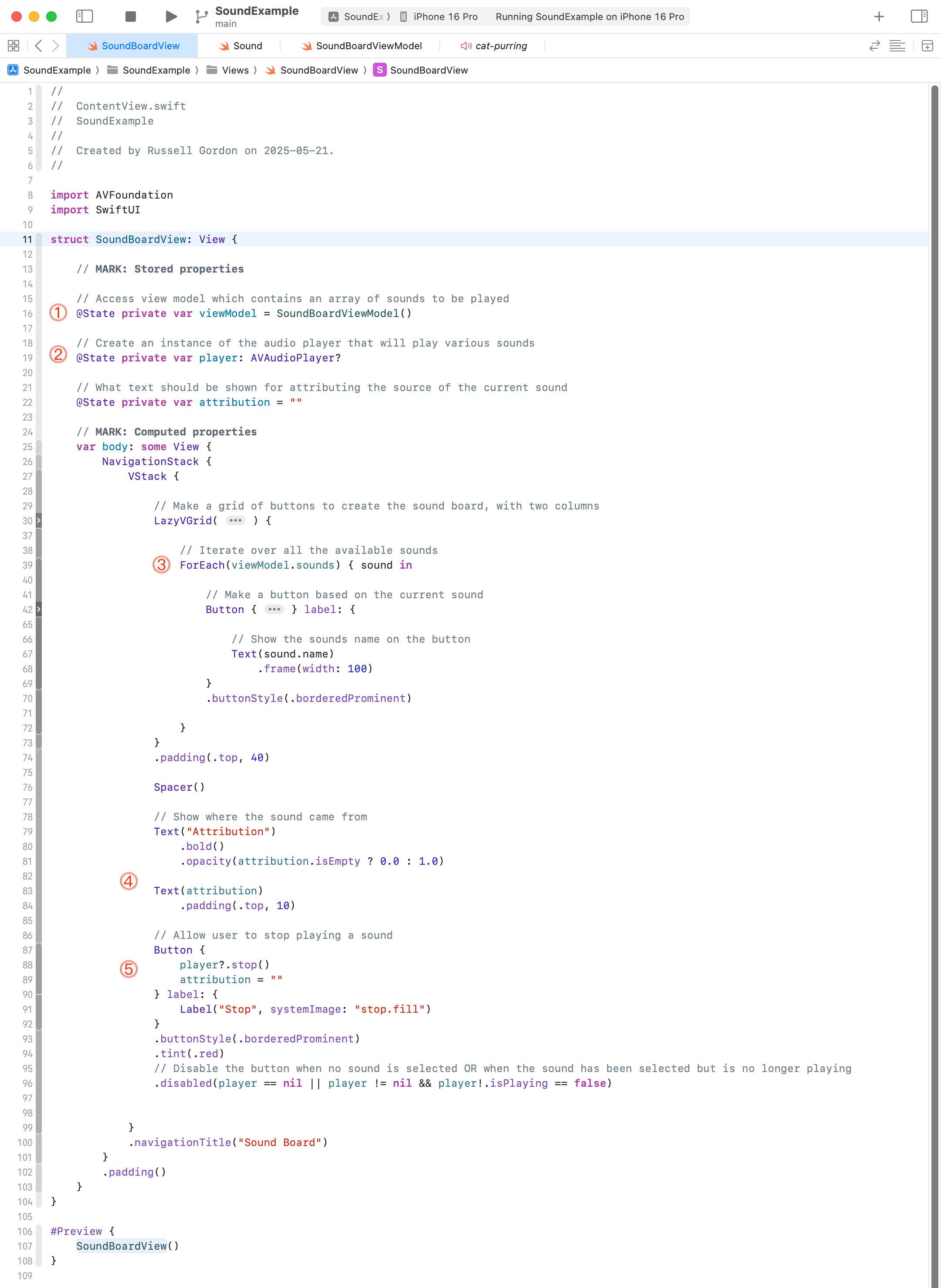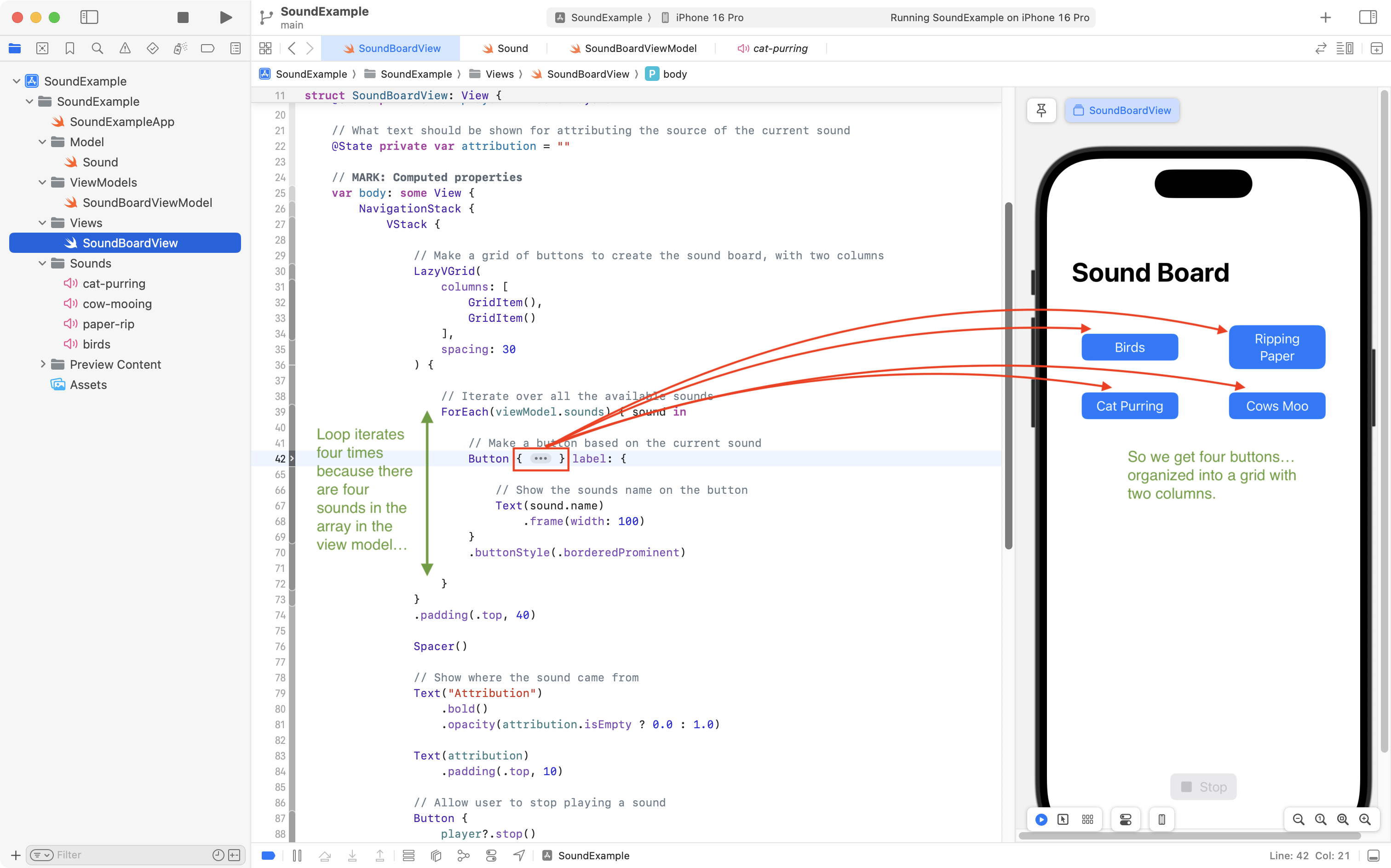 AVAudioPlayer– when there is a sound selected. There will not always be a selected sound – so this stored property is an optional, which means it can contain anilvalue.- We iterate over the array of sounds provided by the view model, inside of a