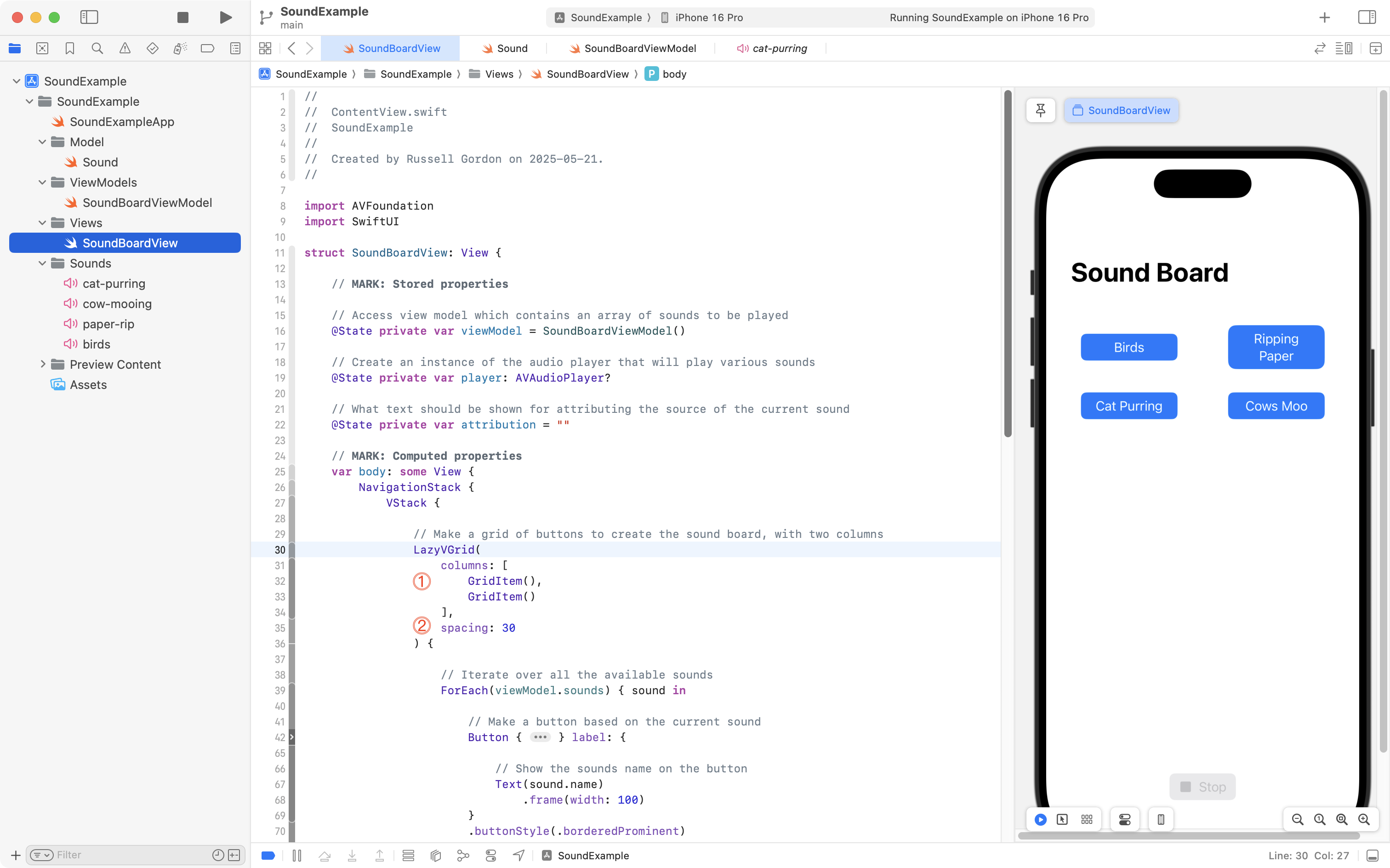 LazyVGridstructure. This way, instead of getting a list with one column of buttons, we get a grid with two columns. More on howLazyVGridworks in a moment…- When a sound has been selected to be played, this text view shows attribution information (who recorded the sound file, where it was obtained, and so on).