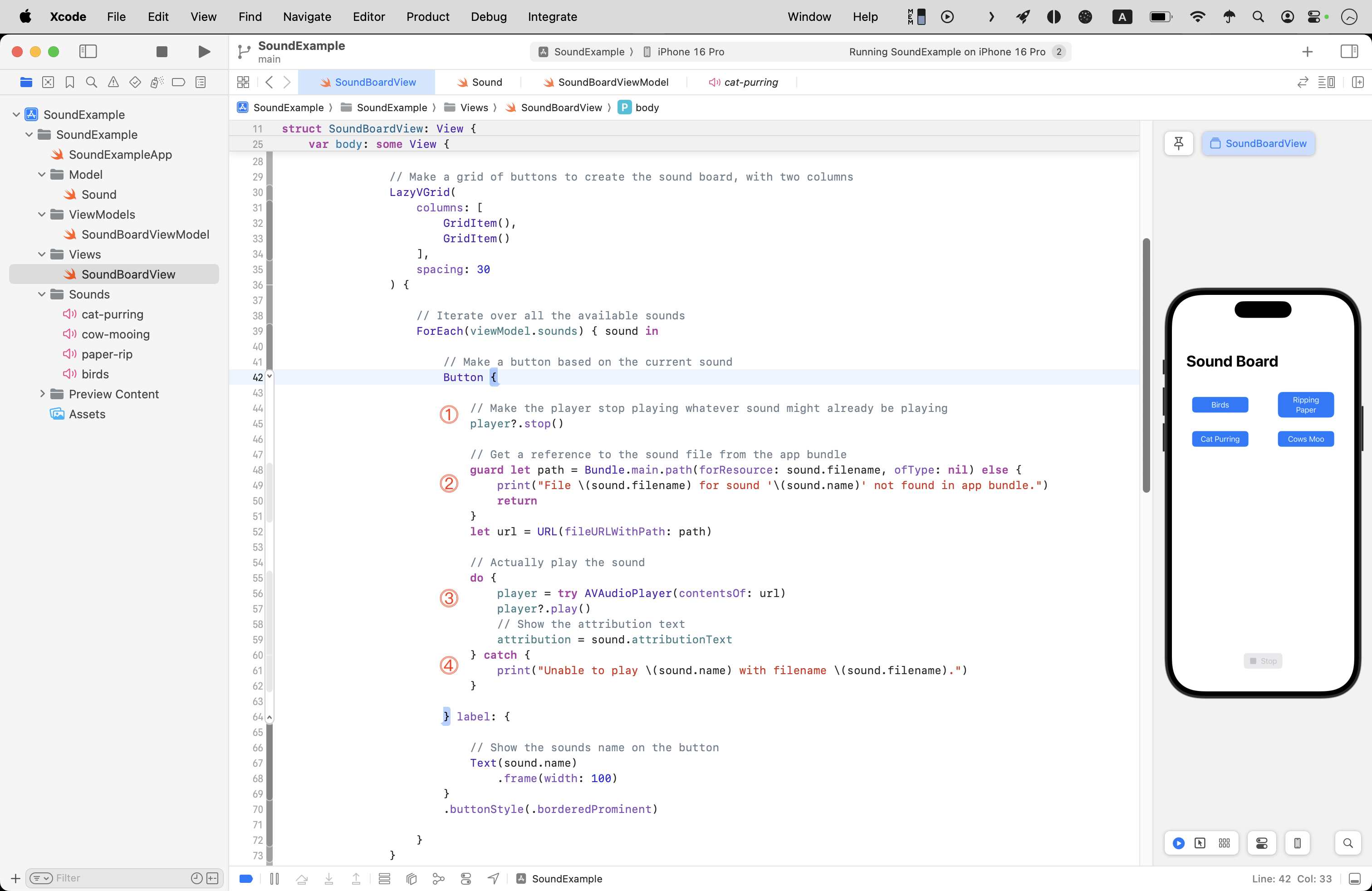 AVAudioPlayerusing the URL that should point to a sound file on the user’s device. Assuming this works, then the instance ofAVAudioPlayeris assigned to the stored property namedplayerthat is created insideSoundBoardView. Then, on line 57, the sound file actually starts being played.- If anything went wrong on any line between 55 and 60, the program will immediately jump to this section of the code and print an error message.